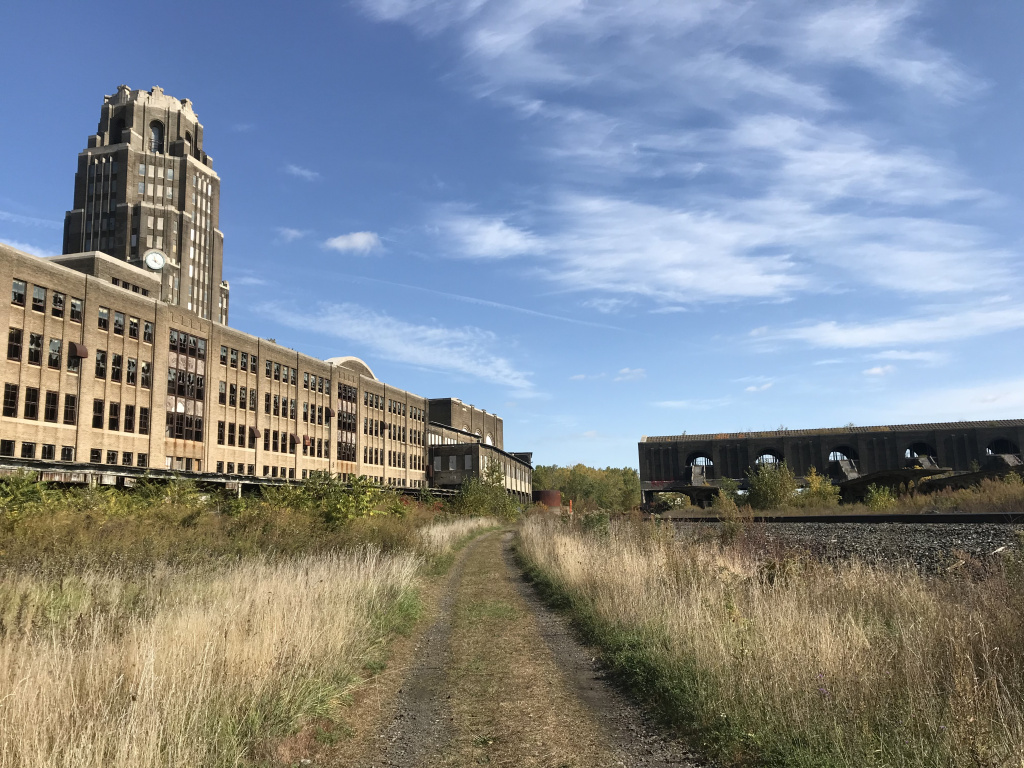 I then rattled over a couple miles of potholed streets to Buffalo Central Terminal, a building I have wanted to see for years. The complex – formerly Buffalo’s main train station – was completed in 1929. Architecturally, it was a masterpiece of high Art Deco (always one of my favorite styles). It was equally impressive logistically, being equipped to handle up to 10,000 daily passengers. Unfortunately, actual traffic never approached this level, and the station was a white elephant within a few decades. It closed in 1979, and has remained shuttered since. Although a local preservation group has managed to secure and stabilize the central concourse, most of the complex has been left to rot for 40 years.