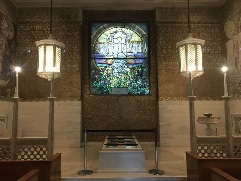 I awoke to rain rattling against my motel window, and drove down desolate Euclid Avenue through a wind-whipped monsoon. Since the bike ride I had planned was out of the question, I decided to start the day by re-visiting Cleveland’s Lakeview Cemetery. In the Wade Chapel – a turn-of-the-century building splendidly decorated by the workshop of Louis Comfort Tiffany – I spent nearly an hour listening to the attendant, who (for lack of anyone else to talk to) outlined every aspect of the intricate decorative program. Then, after stopping into the musty memorial around the tomb of James Garfield, I drove into downtown.