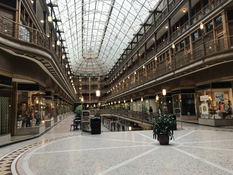 Parking in a rather seedy lot (a homeless man was slumped next to the entrance), I made a brief, brisk circuit of Cleveland’s architectural highlights. My favorite was the Arcade, a late nineteenth-century shopping mall with more decorative cast iron than you could shake a stick at.