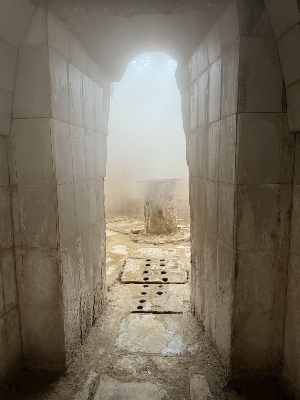 We walked to the top of the terrace, where the spring water – a few degrees below boiling – ran in smoking rivulets over the white stone. The reek of sulfur filled the air. A few members of our group cooked eggs in the water (eight minutes for a soft boil, ten minutes for hard). A short distance away was a small sauna, filled with the rumble of compressed steam. Light shot through perforated stone skylights, brightening and dimming as steam swirled through the room.