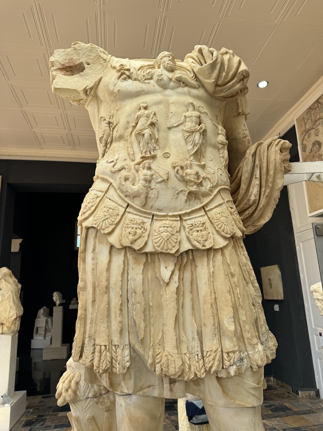 Onward, then, to Cherchell, Roman Caesarea, Juba’s capital and the political center of Mauritania. The town, little changed since the French left, could easily be in Provence. The main square, with its pollarded, white-trunked trees, felt especially European. We began in the museum, probably the richest (and certainly the best-maintained) collection of antiquities in Algeria. The extensive collection of marble statues (many collected in the baths, museum-style, in late antiquity) included several masterpieces. I was especially impressed by the torso of a cuirassed imperial statue, its breastplate bearing a dazzying array of allegorical reliefs. Less accomplished, but equally interesting, was a famous mosaic showing workers toiling in a vineyard. I also liked a richly-carved marble pilaster, where a tiny spider was carved crawling up between the wreaths of acanthus.