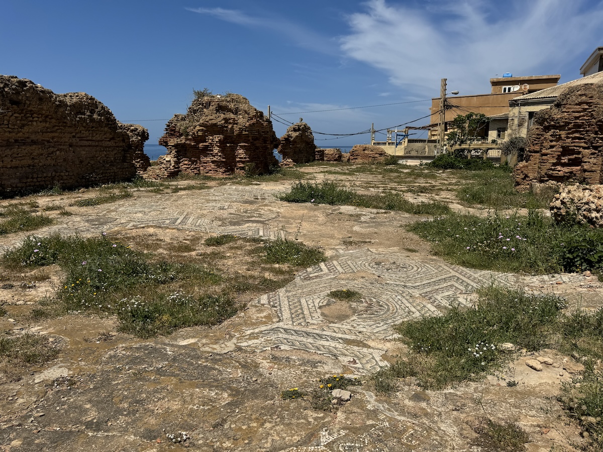 The Roman ruins of Cherchell are scattered and poorly maintained. We stopped at the Roman theater – later converted into an amphitheater – but were unable to take pictures, since a military installation had been built along the edge of the cavea. A short distance away, we visited the Great West Baths. The complex, surrounded by a century-old concrete fence that was itself a ruin, had all the usual components of a large provincial bath. Every part, however, was disintegrating from neglect. The mosaics on the floors were dissolving into scatters of tesserae, and grass had rooted deep into the powdery mortar of the walls. We wandered in ones and twos; and although the roar of traffic was never far away, there was a stillness to the place, half-swallowed by blue of the sea and cloudless sky.
