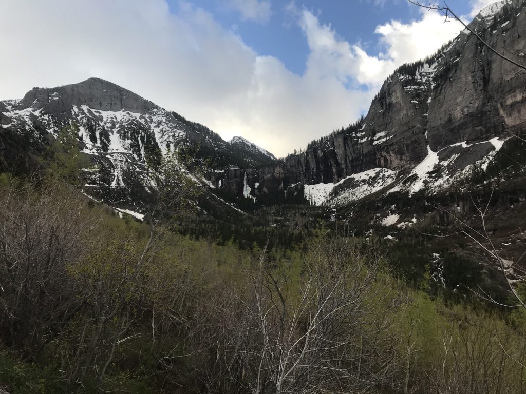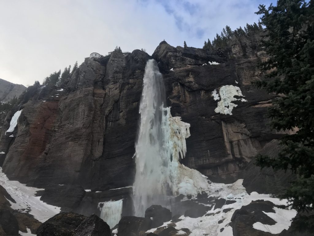 As usual (the Subaru has no curtains), I was up at first light. Since the temperature was just above freezing, I put on my cool weather hiking gear before making the short drive to Bridal Veil Falls, a 365-foot cascade at the head of the valley in which Telluride sits.