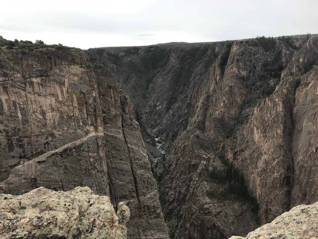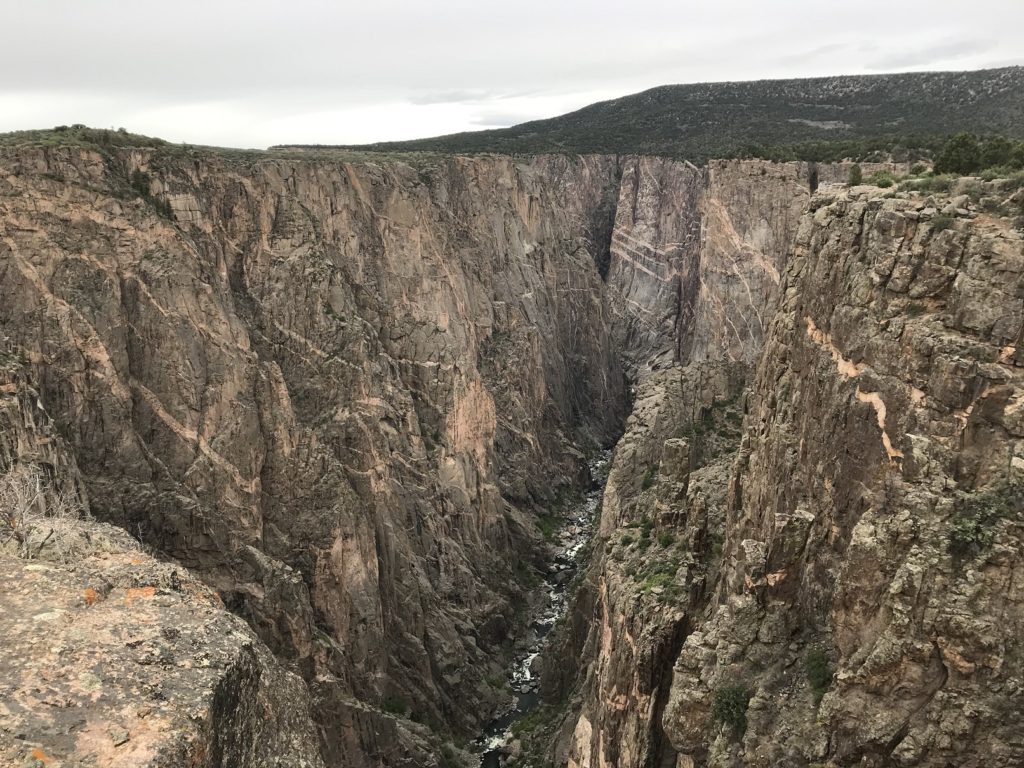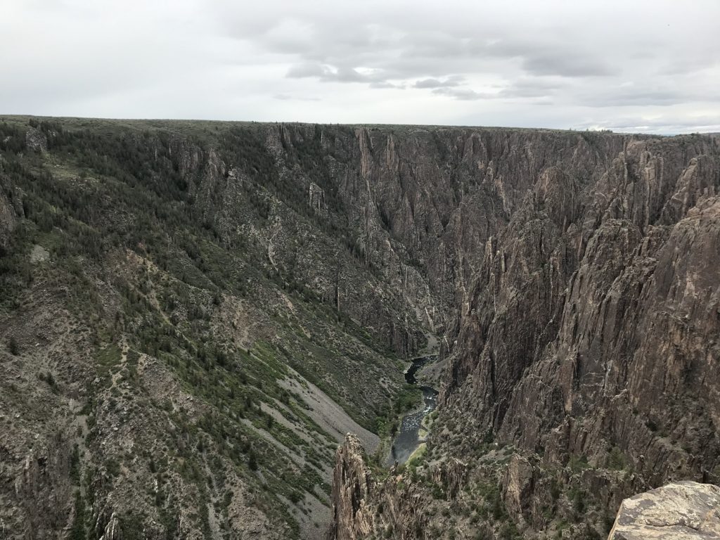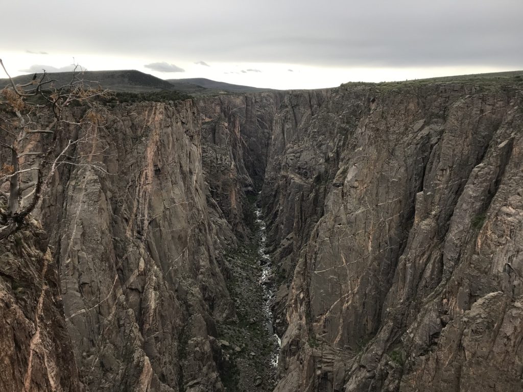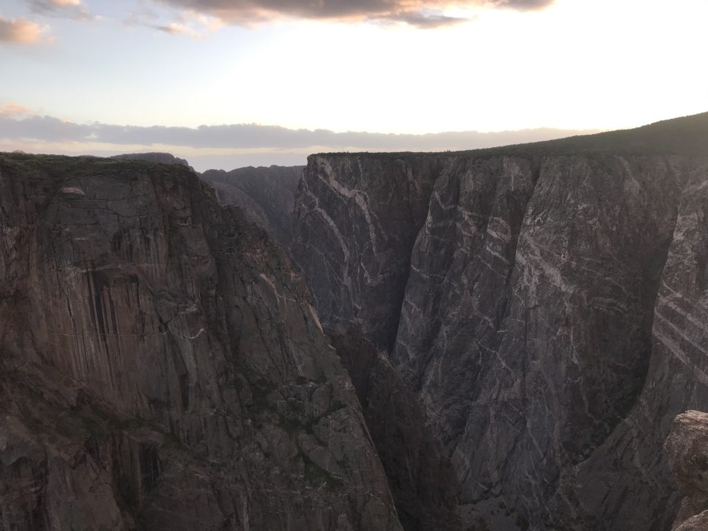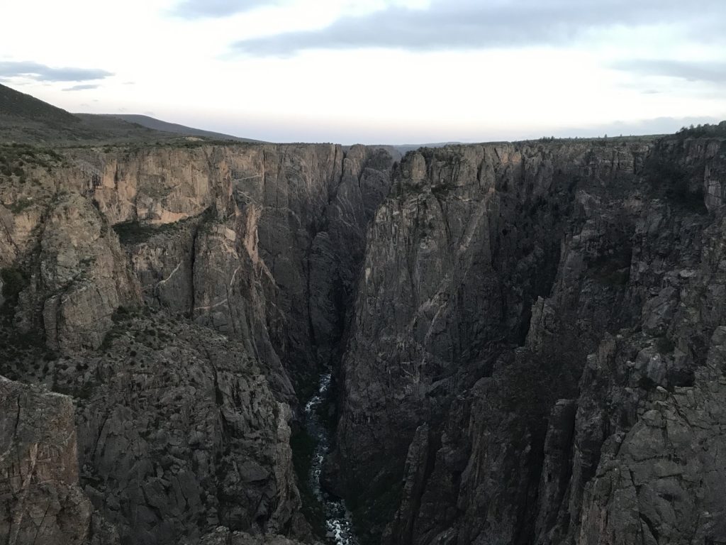 The day’s final destination was the north rim of the Black Canyon of the Gunnison, about 100 miles from Ouray down a series of quiet country roads. The only campground on the north rim is a first-come, first-served facility – and I was just in time to claim the last available spot. Shortly before sunset, I walked down the trail leading to the canyon rim from campground. I had seen the canyon before. But to see it now – with those plunging sides, nearly a half-mile deep, wreathed in the shadows of twilight – was a very different experience, and an unforgettable one.