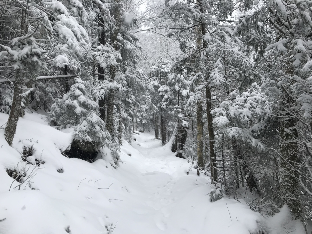 The sun, now streaming directly on the valley, had begun to melt snow from the treetops. Putting on my rain jacket to escape a soaking, I was struck by how rapidly the air began to feel almost spring-like. The savor of sap hung in the humid air as I made my way back to the parking lot, and out along the gravel access road.