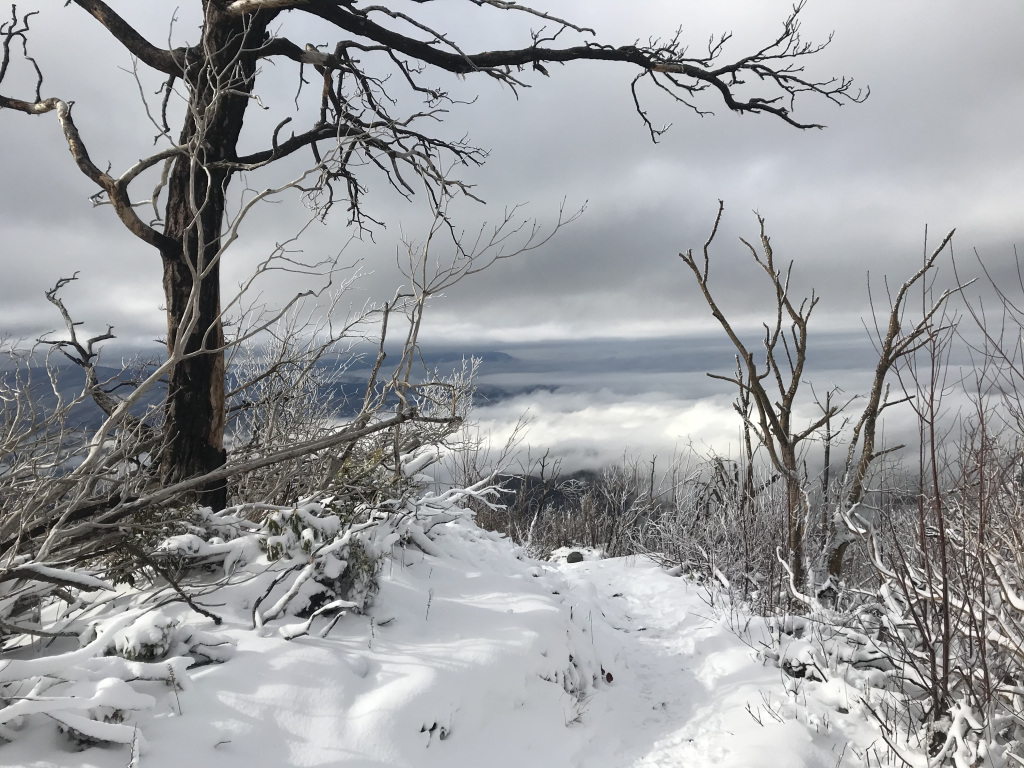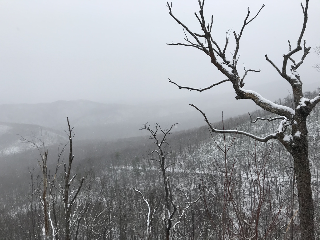My new plan was to hike the Bullhead Trail up to Mount LeConte, the third-highest peak in the park. This trail, which runs through a forest burned by wildfire a few years ago, usually offers expansive views over the Tennessee Smokies. Almost as soon as I started the hike up, however, flurries began to sift through the trees; and by the time I reached the first overlooks, a steady, swift-accumulating snow shuttered the horizon and blurred the hills.
