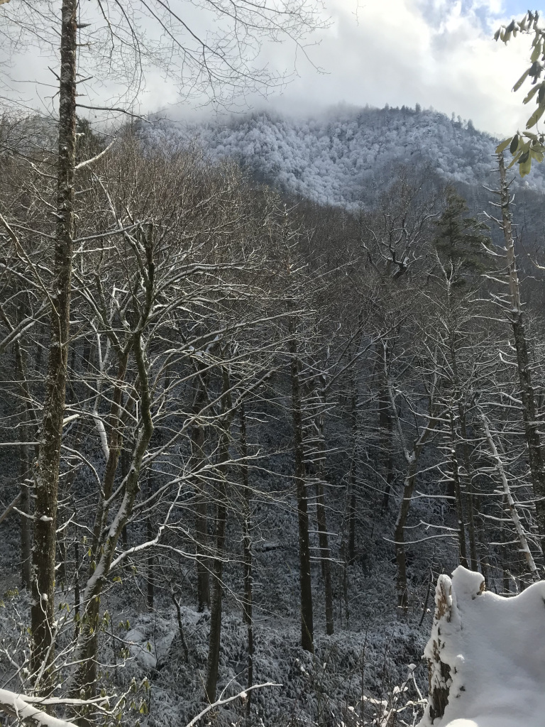 When I woke this morning, I ventured onto my frosty balcony for a first look at the Smoky Mountains. From my hotel, perched on the banks of the Little Pigeon River outside Gatlinburg, I could see a line of sparkling summits – overhung, ominously, by a spreading blanket of clouds. Driving to the visitor center, I discovered that the Newfound Gap road, the highway that cuts through the center of the park (and gives access to the hikes I’d planned) was closed due to ice and snow. With the help of a ranger at the information desk, I hastily planned an alternative hike, and drove off.