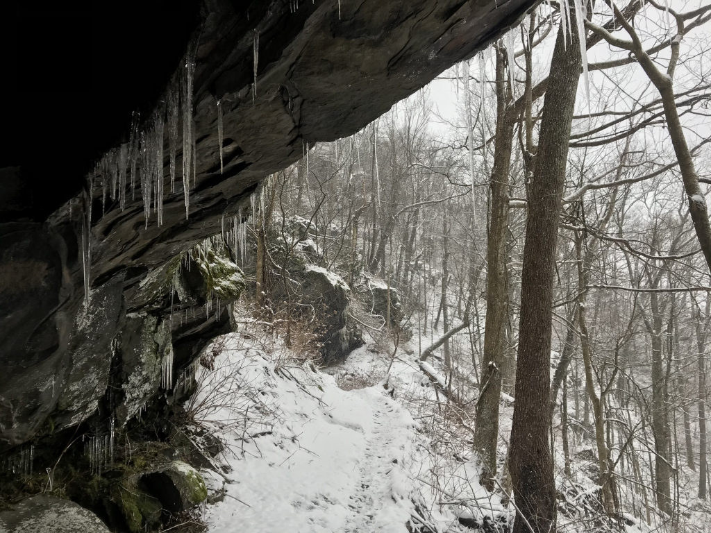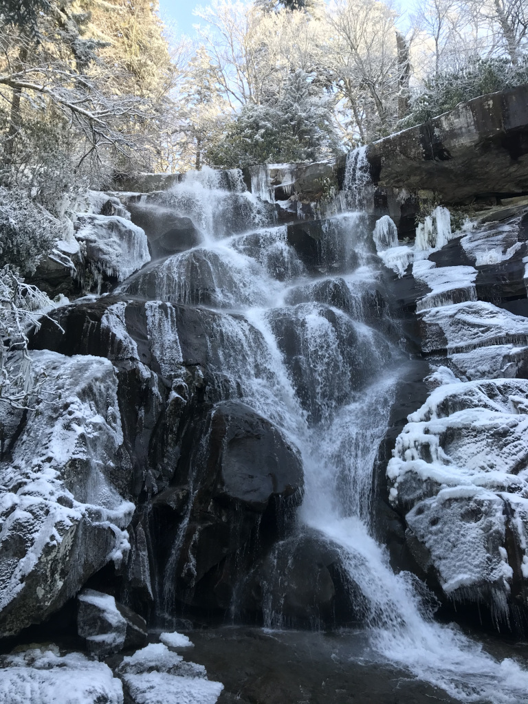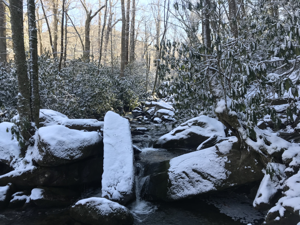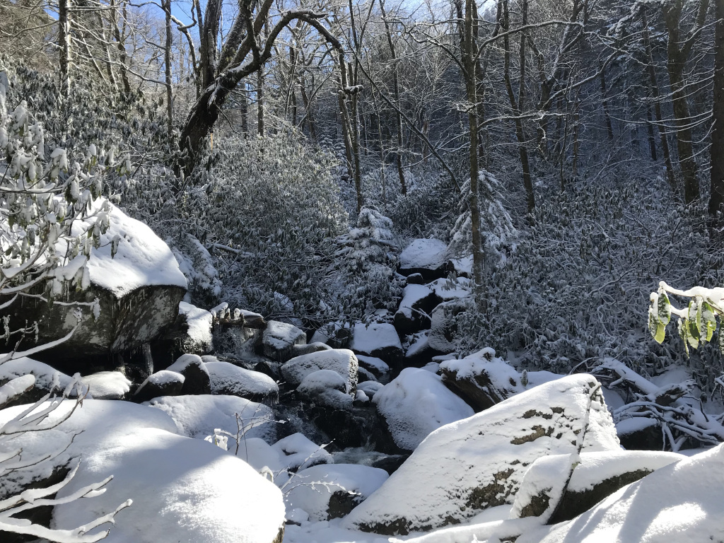 It was a splendid hike. The trail paralleled a rushing wilderness stream, which it crossed and re-crossed on bridges and snow-covered boulders. At first, the valley through which the stream ran was broad and cathedral-like. But it soon narrowed, and the trail narrowed with it, passing through tunnels of snow-shrouded rhododendrons and around the great flaring trunks of towering tulips and poplars. As the sun crested the mountain ridge overhead, the snowy landscape blazed to life, flashing and sparkling in the clean cold air. The real scenic highlight, however, was the trail-side stream, rushing over icicle-draped boulders beneath the drooping rhododendrons.