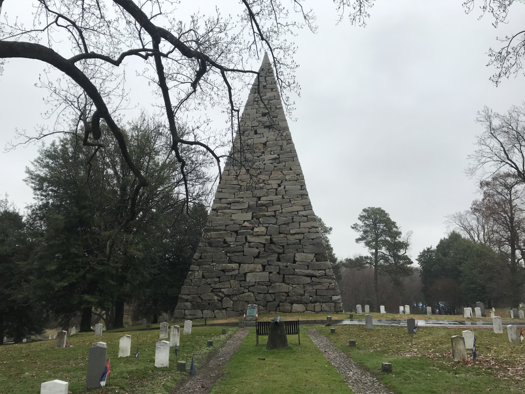 Rain, again. Torrential, unrelenting rain, descending from a malevolent sky. Since hiking was out of the question, I decided to devote the day to the Civil War sites so thick in this corner of Virginia. So I hydroplaned down the highway to Richmond, and pulled into Hollywood Cemetery, the final resting place of several key players in the War Between the States (as they like to call it down here). The most imposing monument in the cemetery is the Confederate Memorial, a 90-foot pyramid of rough-hewn granite blocks. Fringed with cypresses and streaked with rain, it loomed somberly in the background as I walked, umbrella in hand, past rows of tombs punctuated by sodden Confederate flags.