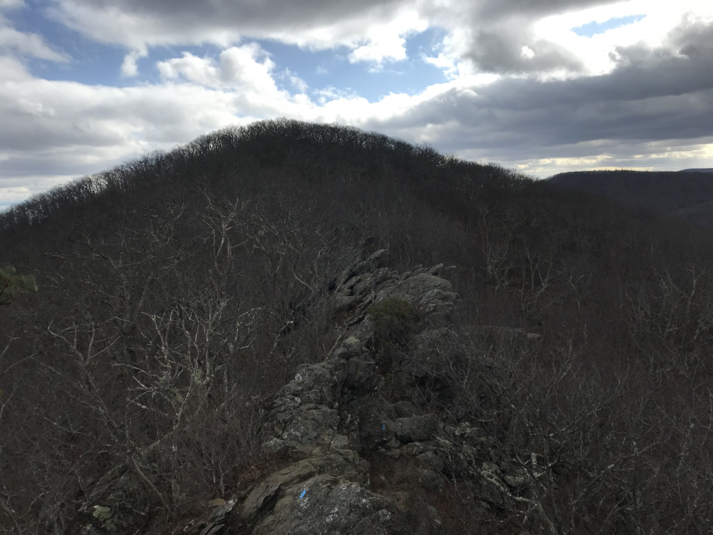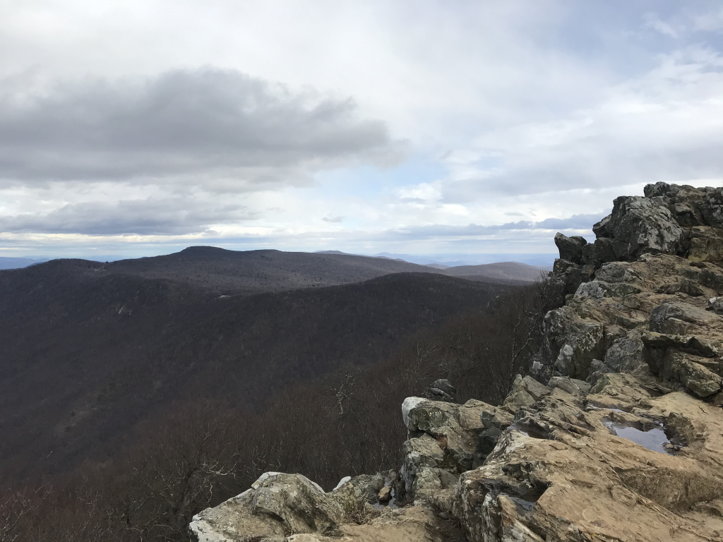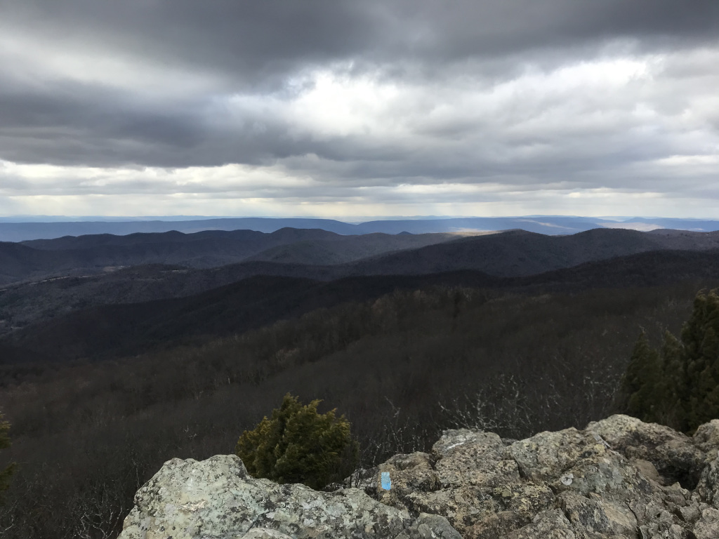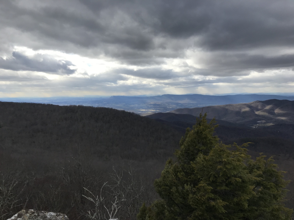 The park’s spine is the famously scenic Skyline Drive, which winds around and among the peaks. Stopping at the first of the Drive’s many scenic pullouts, I immediately noticed two things: the view and the wind. The view, as advertised, was stunning: lines of blue hills, stretching to the cloud-streaked horizon. The wind, less anticipated, was unavoidable: a steady surging stream of air howling over the ridges and through the barren trees. My Sentra wobbled furiously in the gale as I pressed forward.