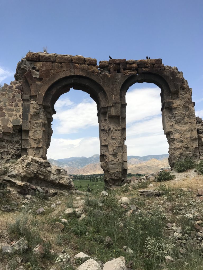 Deep in the foothills, having parked on a dirt road near an anonymous village, I hiked out to one of the most spectacular ruins in Turkey. The Cathedral of Bana, constructed by an Armenian king in the seventh century, was originally a massive circular building nearly 100 feet tall. Virtually destroyed in the late nineteenth century, it survives as a Stonehenge-like ring of piers and arches, stark against a backdrop of dull red cliffs.