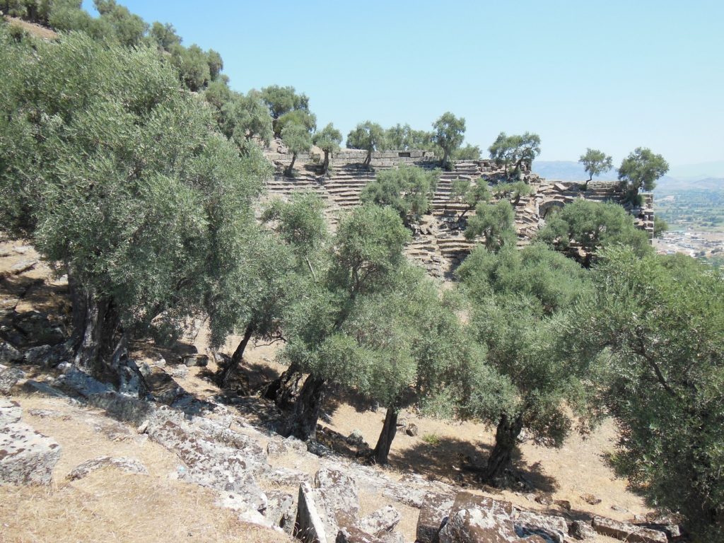The theater of Alinda, well-preserved but overgrown with olive trees, proved a wonderful place to eat lunch. As I sat in the shade, I could see a wide panorama of fields and distant hills where the ancient stage building had fallen away. In the village below, drums were beating at Bayram celebrations; but there was no noise in the theater save the chirp of cicadas, high-pitched in the noontime heat.