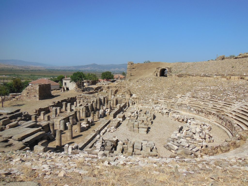 Bumping over short stretches of exposed ancient pavement, I stopped at the large theater, excavated and partially restored by a team from the local university. Though most of the marble seating has long since been quarried away, the retaining walls that once supported the cavea still stand to their full height, and substantial remains of the lowest rows and stage building have been exposed. From the theater, I had a fair view over the ancient city. The Hellenistic walls, still preserved atop the citadel, descended brokenly on both sides towards the plain, where stone-robbing had reduced them to a shapeless mound. The scanty remains of a temple on the adjoining slope were the only recognizable ruins. Elsewhere within the vast area enclosed by the walls, only crooked doorposts, scattered throughout the modern village and the brown pastures beyond, attested to the existence of the ancient city.