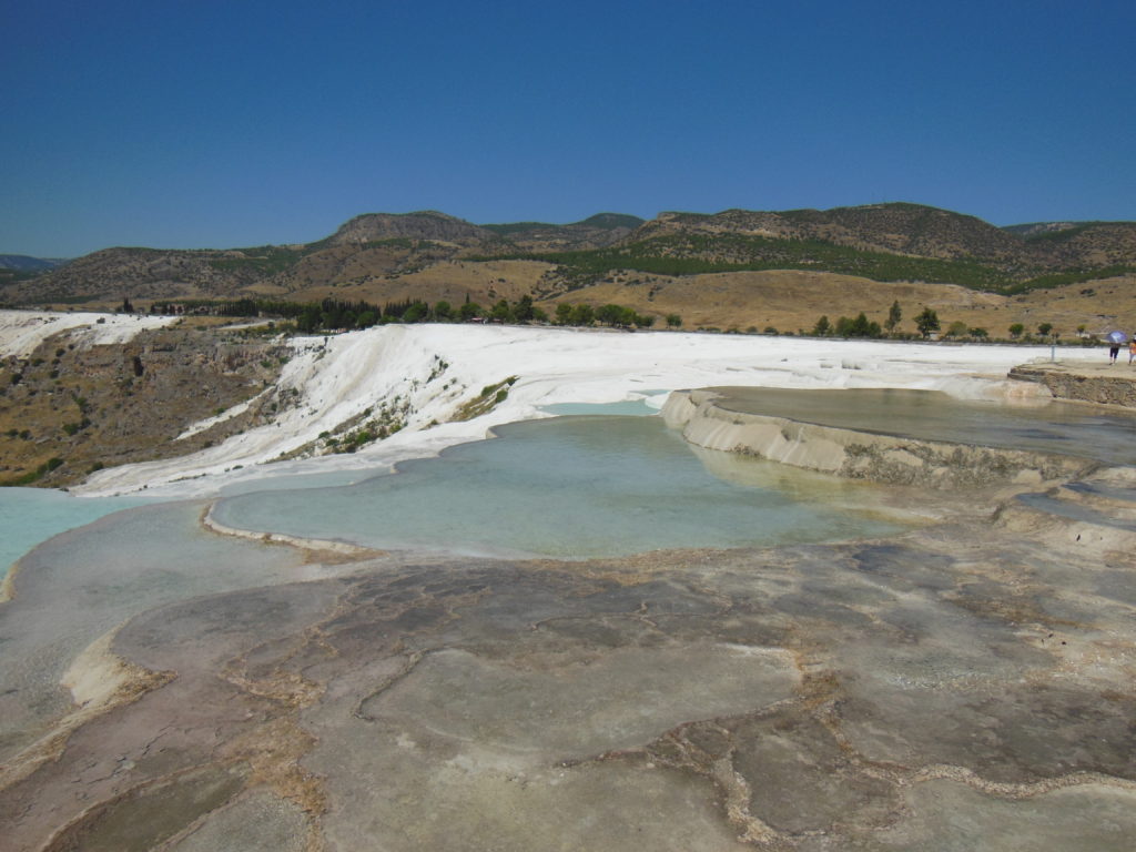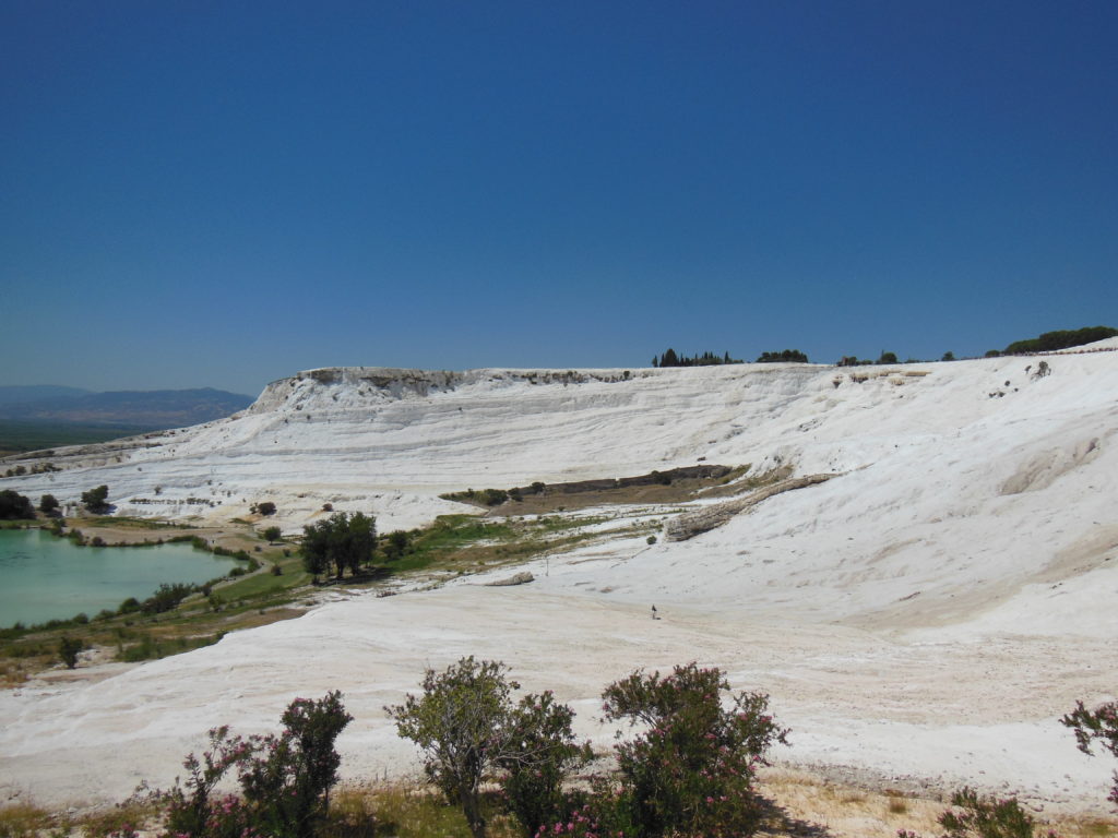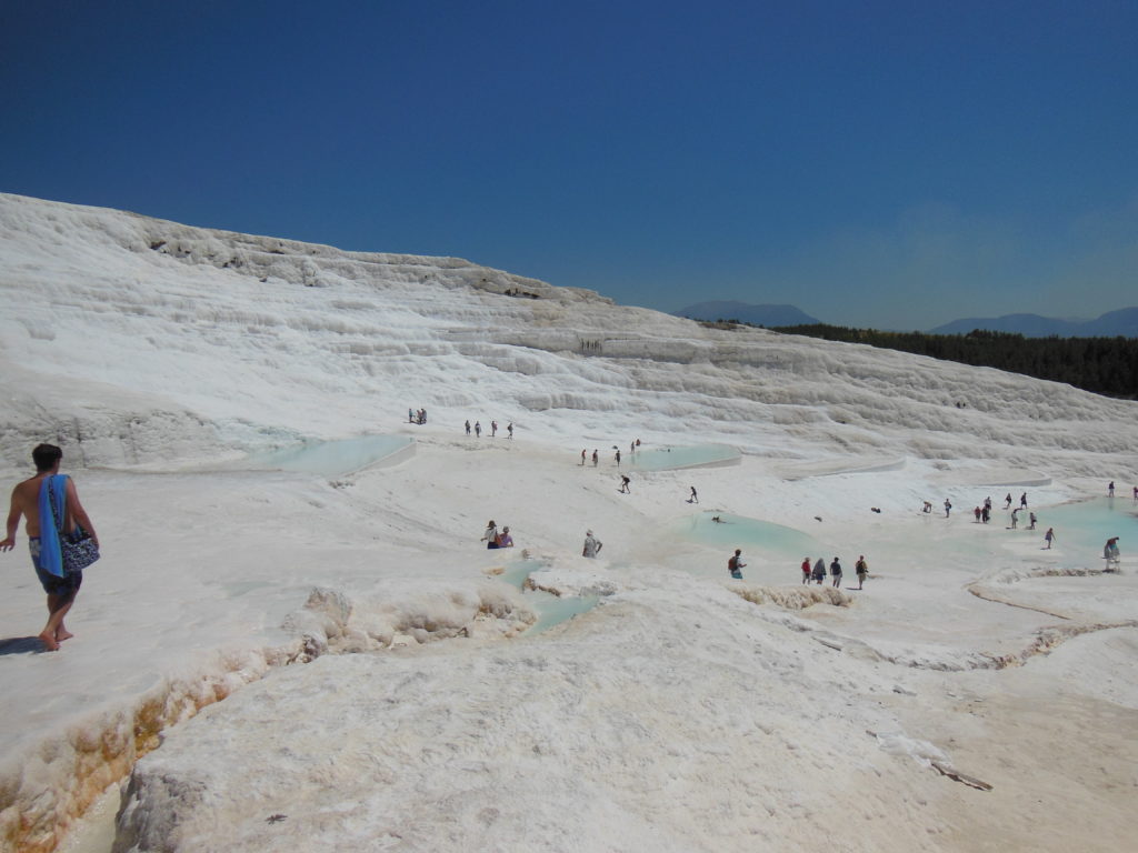 By the time I arrived, literally hundreds of people were walking up and down the slippery limestone. The water that issues from the springs is hot, nearly blood heat; but it soon cools to a comfortable temperature. It is pale and cloudy with its burden of dissolved stone; whenever it settles, a paste-like film soon forms. If left to dry, this hardens into a rocky crust – and so the terraces grow. It was a pleasant walk up and down; but I was ready to put my shoes back on by the end. When not softened by water, limestone is not a forgiving surface. I shuffled back to the hostel, and to unequal combat with the insect kingdom.