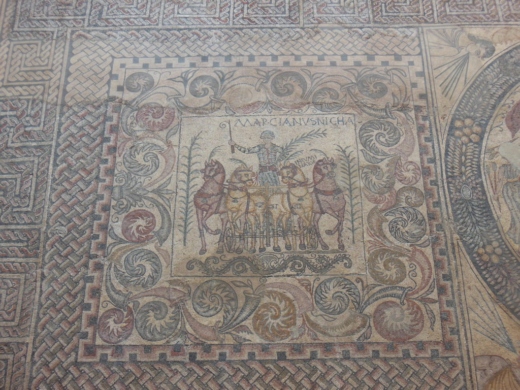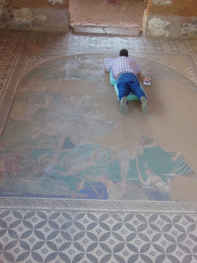 The so-called Villa of Mithras, located just outside the ancient city, was my next stop. It is famous chiefly for the quality of its mosaic decorations, and in particular for a beautifully designed and brilliantly colored depiction of the cosmos, complete with a host of allegorical figures. As luck would have it, this mosaic was under restoration at the time of my visit –which meant in effect that my attempts at appreciation were marred by the overweight technician sprawled across its center.