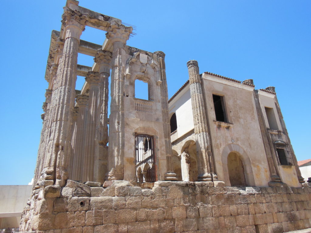 After passing a well-preserved aqueduct – one of the two that once served Merida – and snapping a few pictures of the cranes’ nests atop its broken piers, I spent a few minutes wandering the vast and dusty confines of the Roman stadium. Feeling the warning signs of sunburn, however, I soon retreated to the shady lanes of the medieval city, where other Roman remains rise among the press of later buildings. The most impressive ruin is probably the so-called arch of Trajan, a monumental gateway more than thirty feet tall now ingloriously sandwiched between a barber shop and a clutch of cheap apartments.