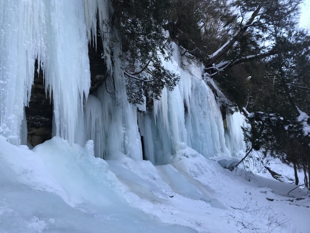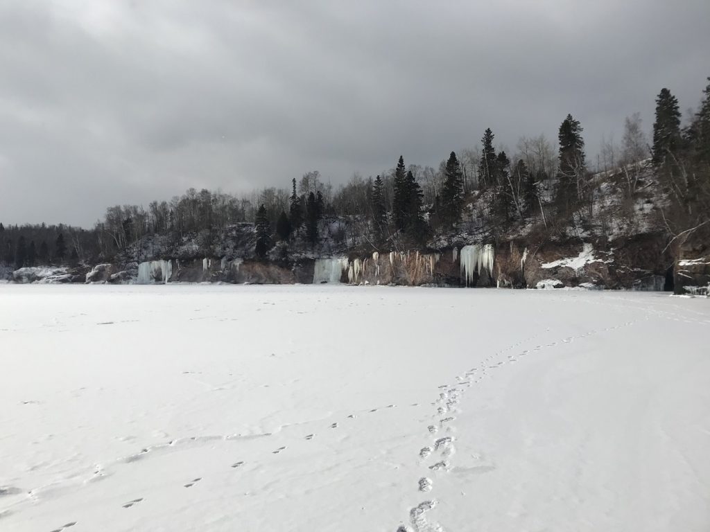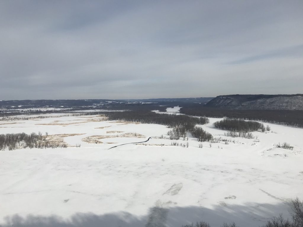 Emboldened by the weather (the temperature had risen to a balmy 12 degrees) and in the mood for a short hike, I walked a mile or so along the bluff tops. Although a narrow trail had been packed into the snow, any stray step plunged into well over a foot of powder. Whenever I ventured to glance up from my feet, I was treated to a series of bluff-top views and frozen waterfalls.