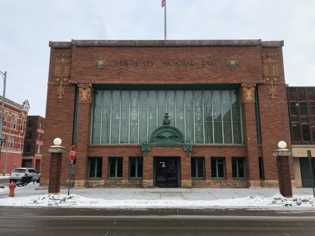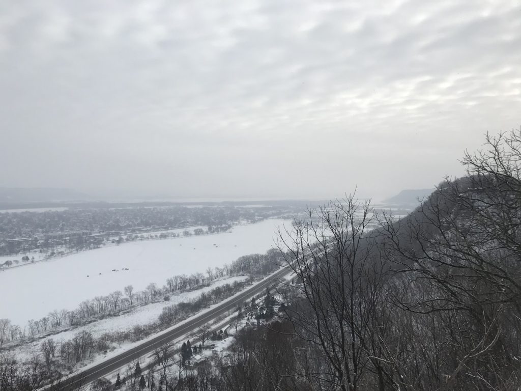 By the time I emerged from my hotel in La Crosse, the temperature had edged above zero – my car thermometer registered four above – and a light snow was falling. The snow intensified as I crossed the river into Minnesota, hiding the bluffs on the Wisconsin side. After stopping in downtown Winona to see a few gems of early twentieth-century commercial architecture, I drove to a bluff-top park for a sweeping overlook of the city and river, dreamlike behind millions of snowflakes.