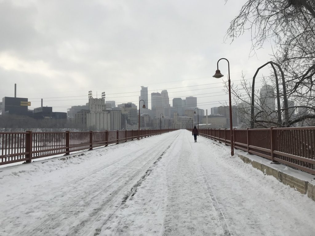Fleeing the melancholy of middle age, I drove on to the Twin Cities. Although I’d spent a fair amount of time in Minneapolis and St. Paul during my years at Carleton (I used to moderate high school quizbowl matches there on weekends), I had never really explored them. So I started with a stroll down Stone Arch Bridge, the nineteenth-century railroad viaduct that crosses the Mississippi in the heart of downtown Minneapolis. A passing snow shower blurred the skyline and icy St. Anthony Falls. After a few pictures of Lock and Dam no. 1, I hurried back to my car (I’m fairly sure it was illegally parked) and headed over to St. Paul.