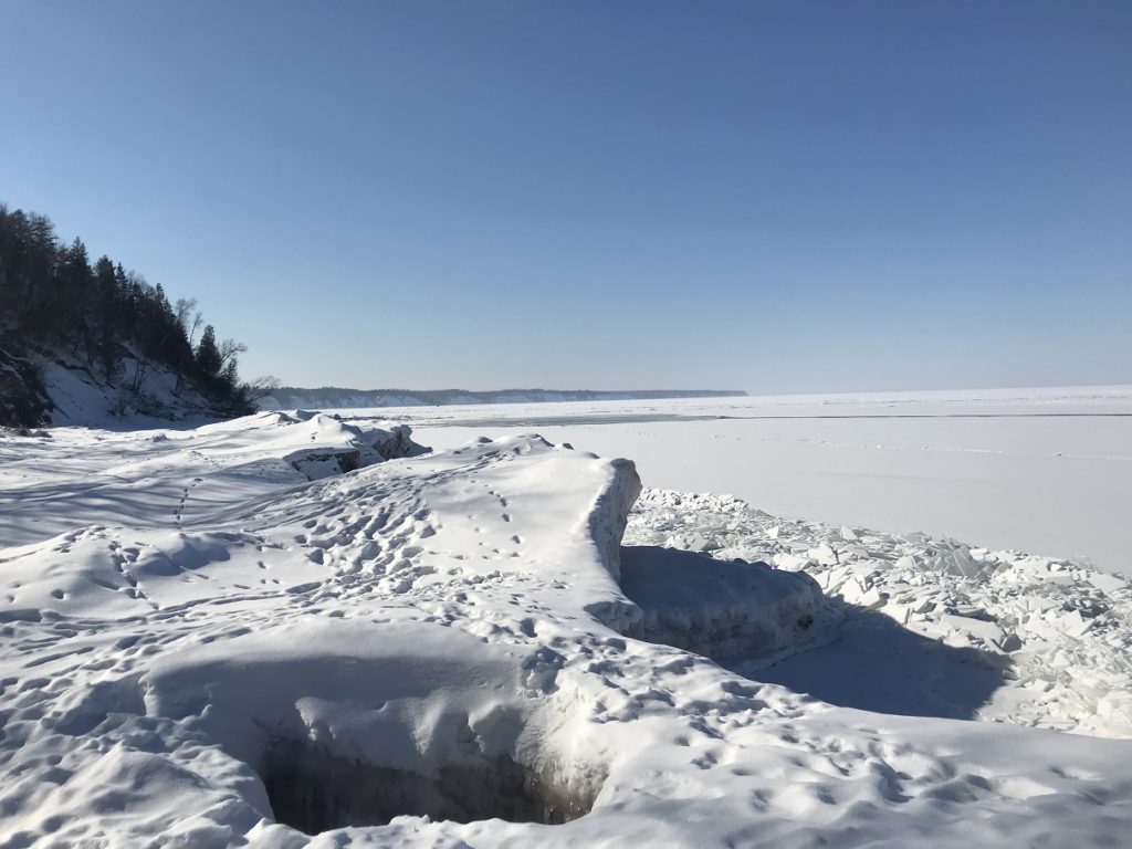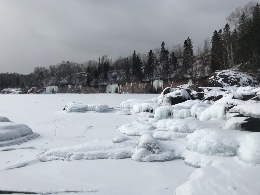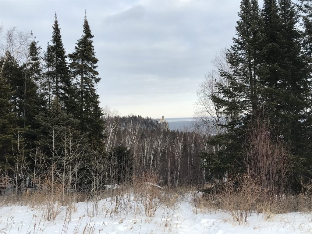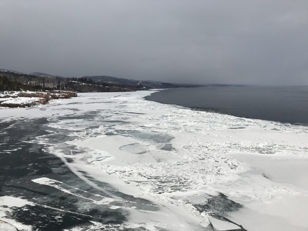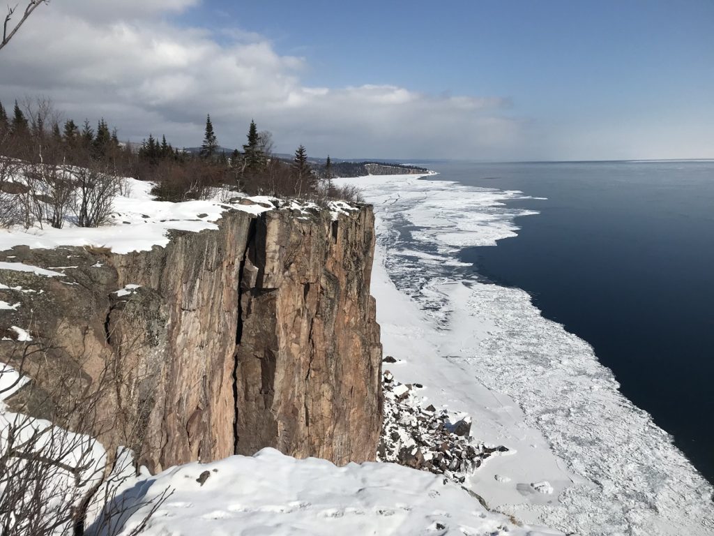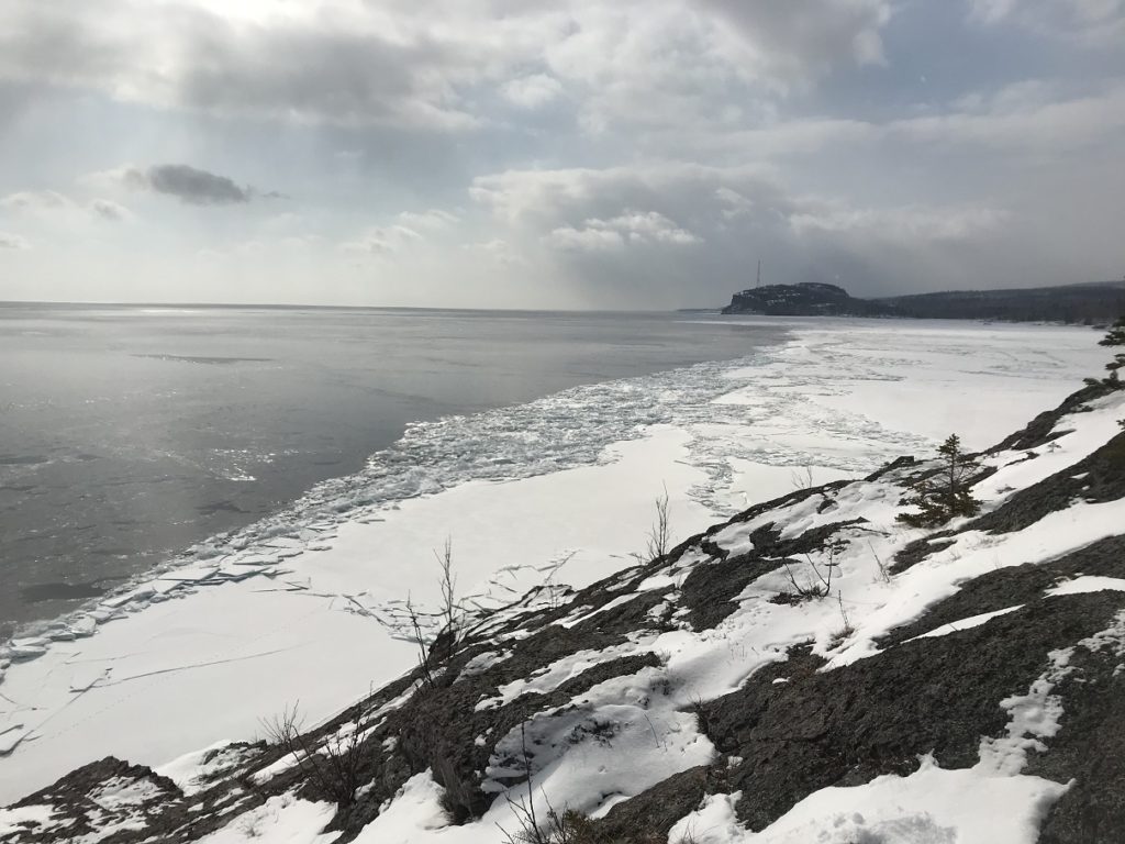 I started my car – according to the thermometer, it was one below zero – scraped the worst ice from the windows, and set out as the sun rose over the hazy Minneapolis skyline. Two hours or so later, I came into sight of Lake Superior, frozen as far as the eye could see. Passing through Duluth, I continued to Palisade Head, the most imposing roadside overlook on the North Shore. When I last stopped here, on an October day in 2019, the birches and maples on the hillsides had been in full fall color. Now the hills were shimmering with snow, and a galaxy of ice floes crowded the shore.