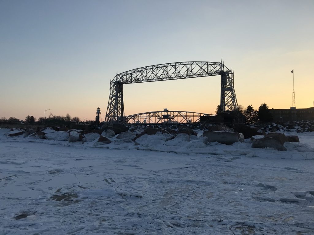 In Duluth, I parked beside the Aerial Lift Bridge. After a few pictures of the frozen harbor and ship channel, I walked out onto the lake ice (here, as I could see from cracks, at least two feet thick). The bridge and channel lighthouses were glowing in the sunset, and the snow-covered lake shone.