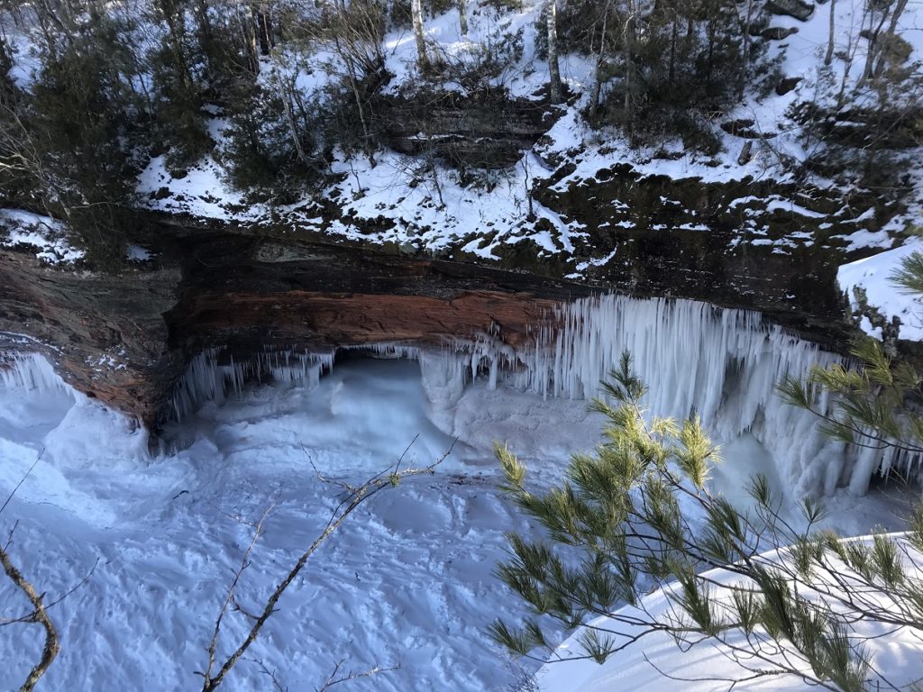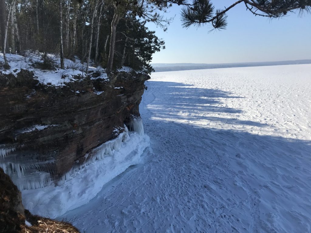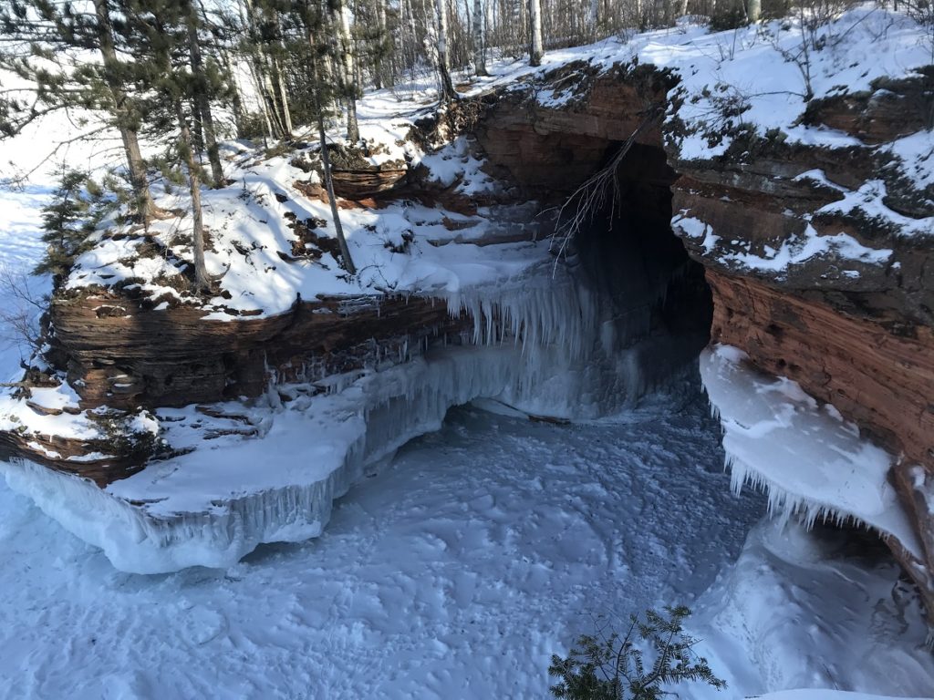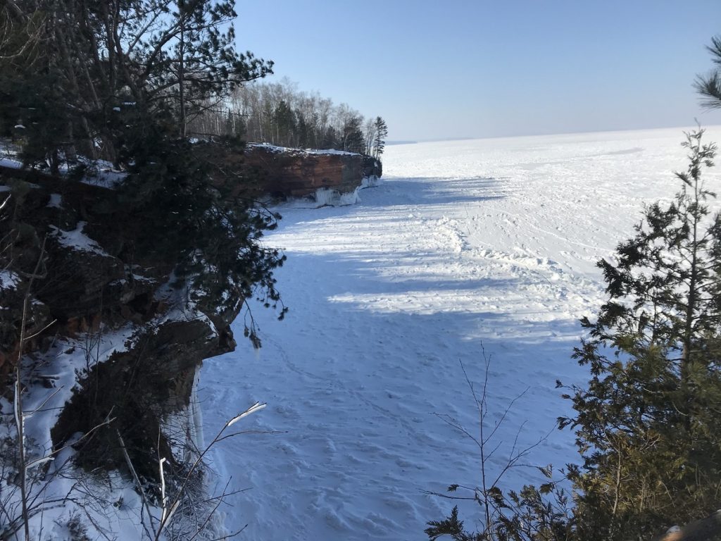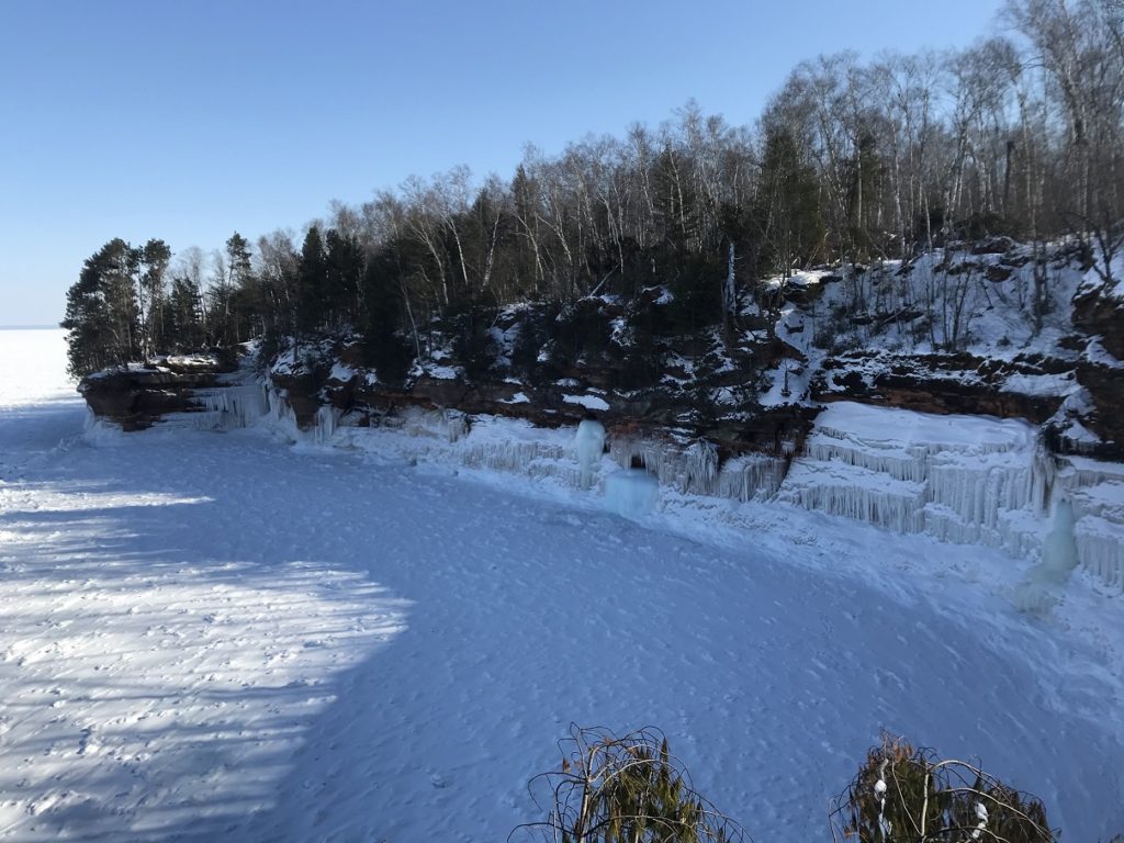 Sunny and three below this morning. Heading east, I passed fields of sculpted drifts, snow-covered pines, and – through gaps in the trees – moonscapes of lake ice. After about an hour, I entered the Apostle Islands National Lakeshore, famous for the ice caves that form along its lakeside cliffs in winter. Thanks to a combination of global warming and bad luck, the caves – once open almost every year – have been closed to the public since the winter of 2015. After the cold weather of the last two weeks, there was some hope that they would be opened again. Yesterday, however, the park announced that, thanks to rough ice and the general inadvisability of drawing crowds during a pandemic, the caves would remain closed.