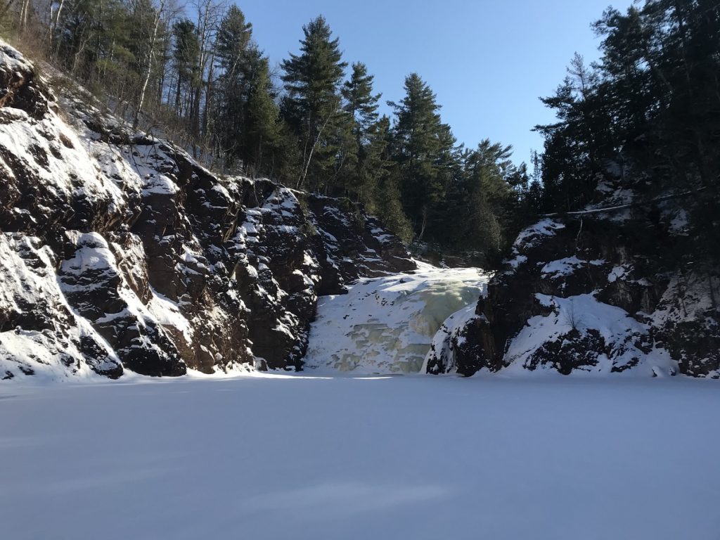 Walking to the mouth of the frozen Baptism River, I ate my lunch (trail mix) while flurries drifted down over the ice. Then I hiked a mile and a half or so upstream. The main trail, overhung with snowy pines, was easy to navigate. The steps connecting the trail with the river, however, were icy to the point of impassability. I could only go down by “skiing” on my hiking boots, and could only get up by wading into the deep snow on the either side of the path and clinging to every convenient tree. The effort of getting down the final staircase, however, was justified by a spectacular frozen waterfall, dusted with fresh snow, at the head of an amphitheater-like canyon.