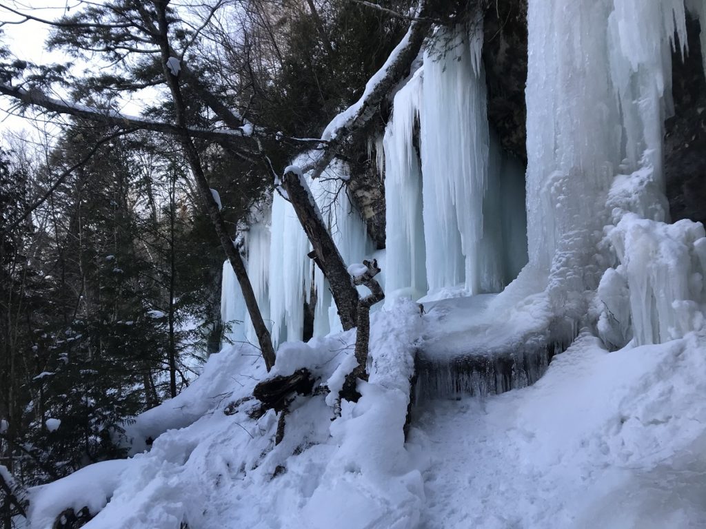 It was warmer this morning – well into the teens – but breezy; snow from the hotel roof showered my car as I loaded the trunk. I drove straight to the day’s main destination: Pictured Rocks National Lakeshore. I began by exploring a series of ice formations produced by springs spilling over a low sandstone cliff. The central formation – “The Curtain” – was as impressive as anything in the Apostle Islands.