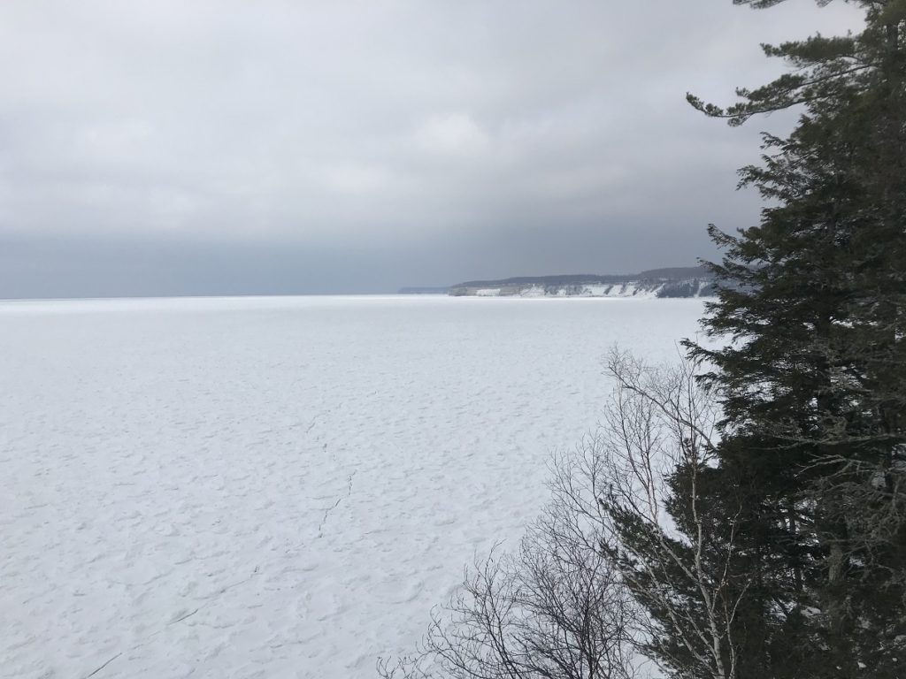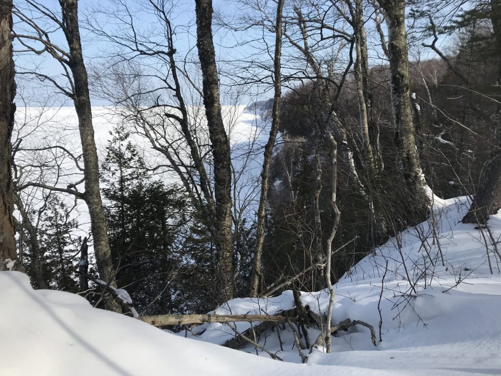 Since my favorite part of the park – the area around Chapel Beach – was inaccessible, I settled for a ten-mile hike up and down the North Country Trail. Here, as for most of its length, the trail runs along bluffs overlooking Lake Superior. The woods – maple and birch, punctuated here and there by groves of huge cedars – were quiet and shrouded with snow. Waterfalls shimmered at the heads of plunging gorges. Across a frozen bay, forty-foot icicles shone on the cliffs of Grand Island.