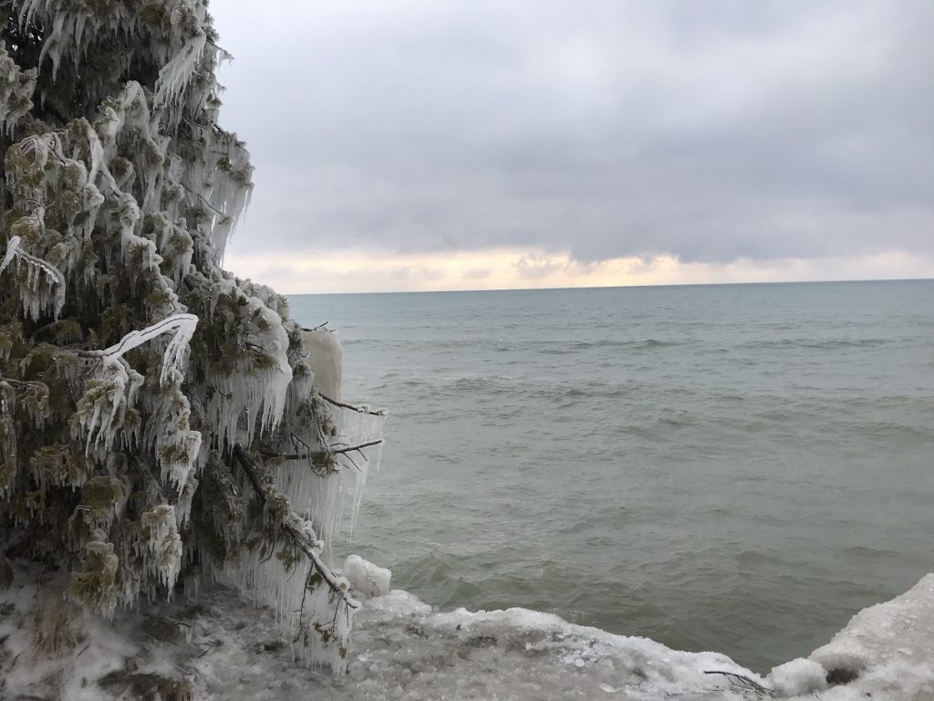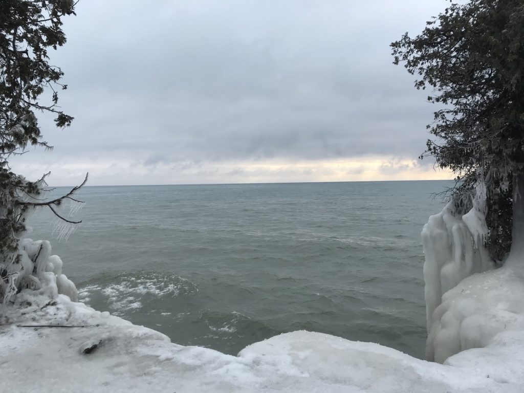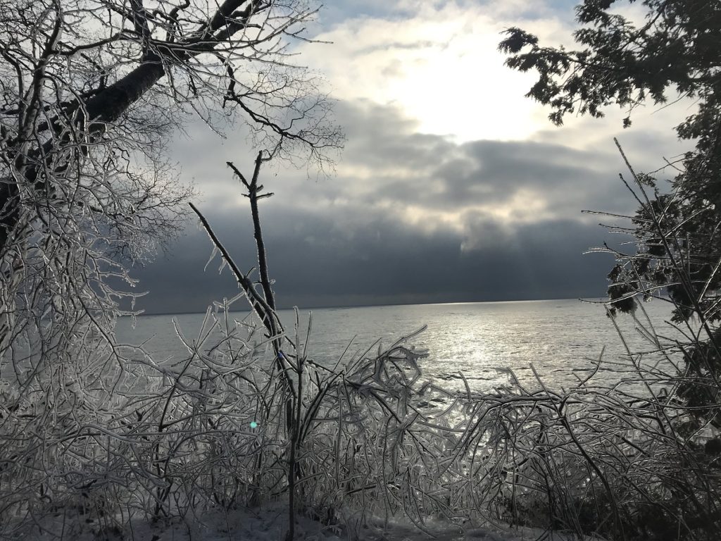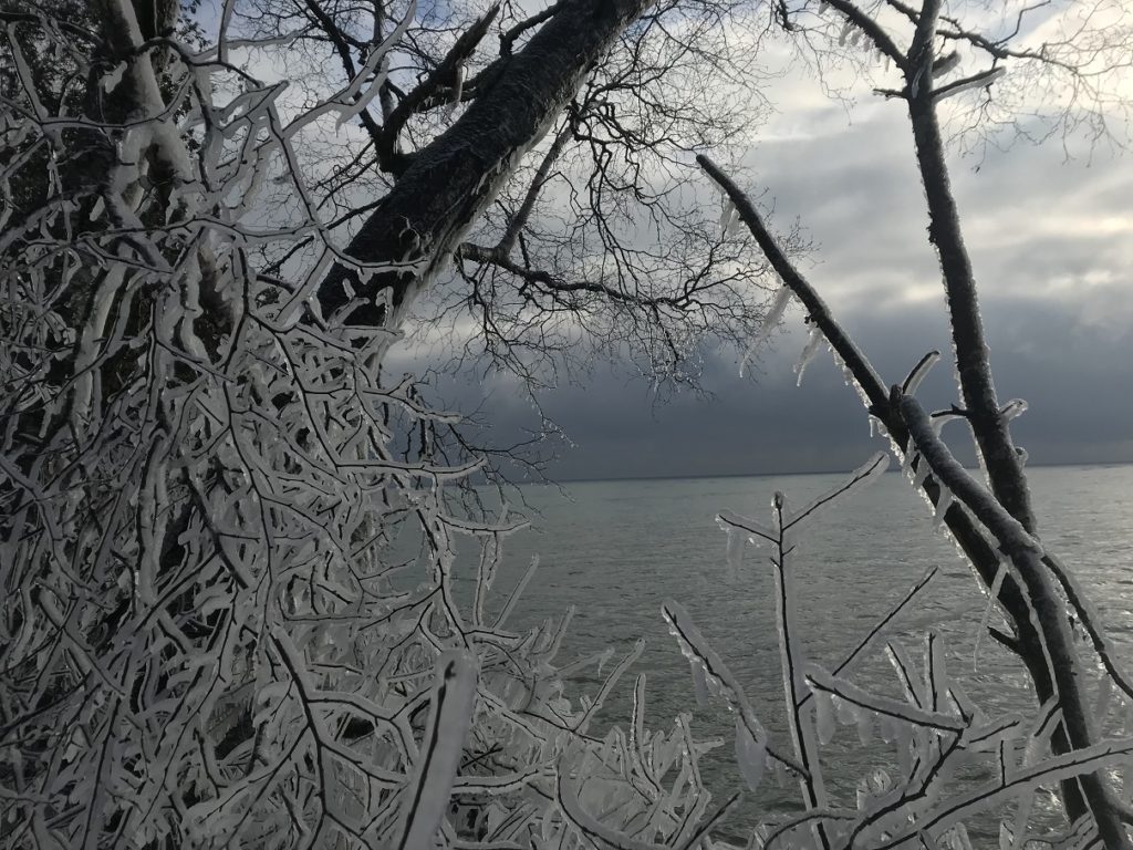 In winter, the spray flung by the waves sheathes every rock and tree along the shore in thick layers of ice. During my visit, the dramatic ice formations were counterpointed by the sky –brooding clouds at first, then brilliant shafts of sunlight. Far out over the lake, beyond the glittering trees, snow slanted down on the gray lake.