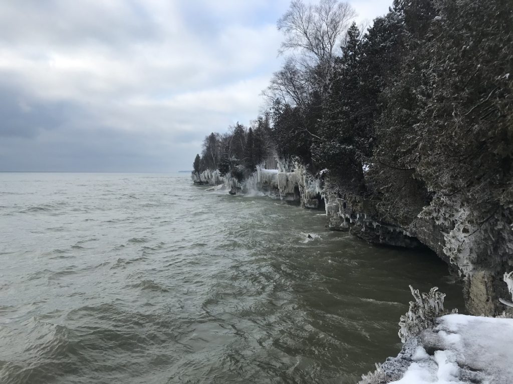 Brushing two inches of fresh snow off my car, I set off into Door County. During summer, this is vacationland, overrun by antiquing retirees and RVs with Illinois plates. In late February, however, even Door County is quiet. I was the only visitor at Cave Point County Park, famous – among people who visit Door County, that is – for its limestone sea caves, which waves strike with a roar that can be heard for a half mile. Thanks to a stiff south wind, the waves were in fine form during my visit, surging and booming over the rocks.