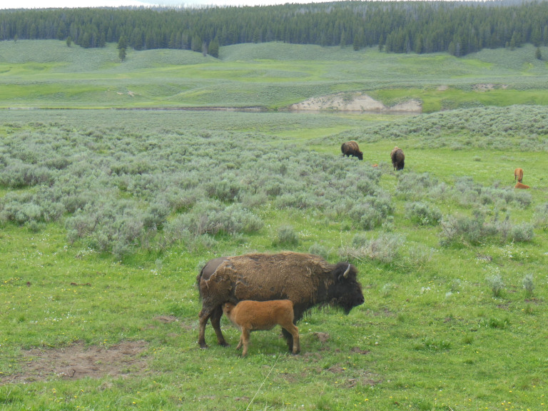 My progress across Hayden Valley was, predictably, slowed by wildlife on and around the highway. A massive herd of bison crossed the road just in front of me. Most buffalo were mangy with half-shed winter fur. Others were trailed by newborn calves; I was particularly impressed by a calf that managed to nurse from its mother while she was walking.