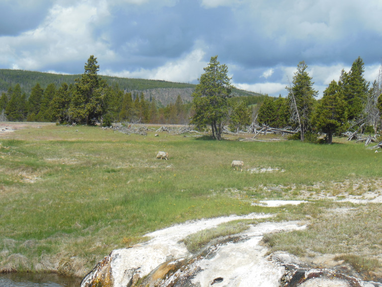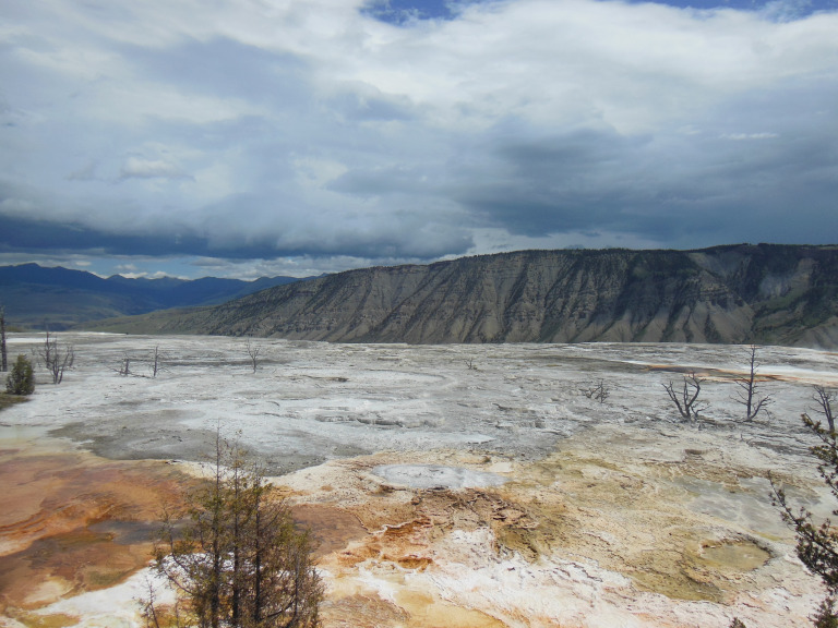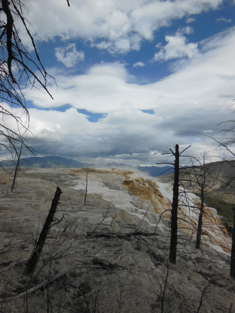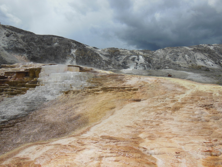 I drove on to Mammoth Hot Springs, where, after jockeying furiously for a parking spot, I was forced to remain in my car for a half-hour by a series of thunderstorms. Once the weather cleared, however, I spent an hour wandering among the famous travertine terraces. Like coral reefs, the terraces build on the bones of their ancestors, spilling and swelling brilliant streams over the chalky channels of past years.