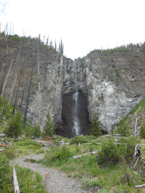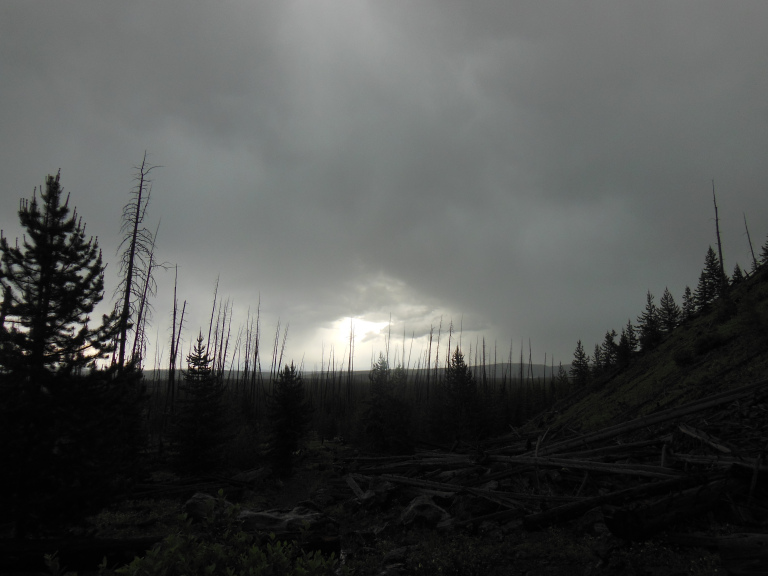 The sky was cloudy by the time I reached Fairy Falls, a thread of white water drawn over a black cliff. A few hundred yards from the falls, I saw the pitchy clouds of a thunderstorm racing over the cliff. By the time I extricated my raingear and pack cover from my daypack, the first fat drops had begun to spatter on the dust. Drizzle turned to torrent as I ran down the path, looking for any kind of shelter. Settling on a dense thicket of pine saplings, I stood atop a tangle of charred trunks, watching blinding curtains of rain and sheeting hail sweep over the adjacent meadow.