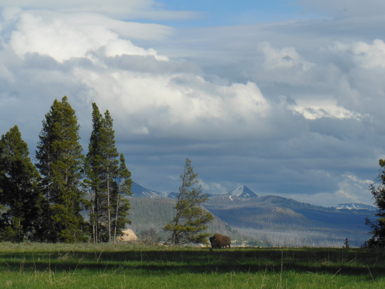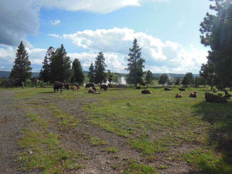 I didn’t bother to take shelter this time. Trusting in my raingear and pack cover, I trudged for an hour through gray drizzle and gray forest, pausing only to cow any nearby bears with periodic clapping. The sun came out after a few miles, shining with a determination that scorched my face and neck. Sodden and sunburnt, I finally came to the end of the trail – only to find it blocked by hundreds of bison.