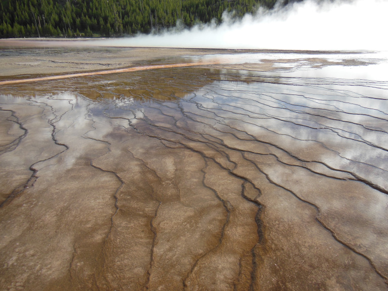 Midway geyser basin, by contrast, was a disappointment, since the stiff wind whipped steam off the Grand Prismatic Spring in a direction that obscured it from the boardwalks.