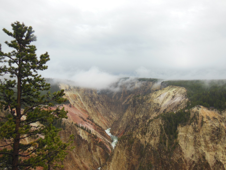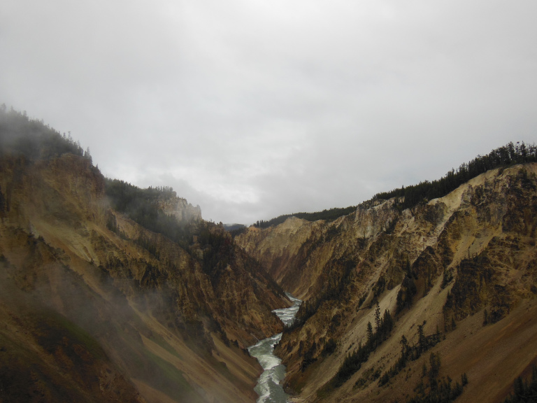 I ventured out into stinging sleet to attempt Uncle Tom’s Trail – a network of footpaths and boardwalks that passes just in front of the Lower Falls of the Yellowstone River. Unfortunately, this trail was also closed, icy spray from the falls having made it impassable. Stymied again, I hiked a series of overlook trails on the north and south winds. Though not as deep as some of the canyons I have seen this trip, the Grand Canyon of the Yellowstone is among the most colorful, the stone of its walls brilliantly dyed by the mineral effusions of hot springs. The light was poor – it was still raining – but the dragging dark clouds and billowing mist were evocative, if not photogenic.
