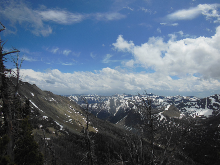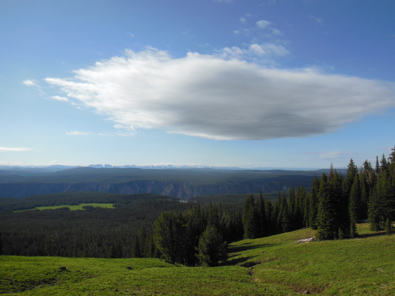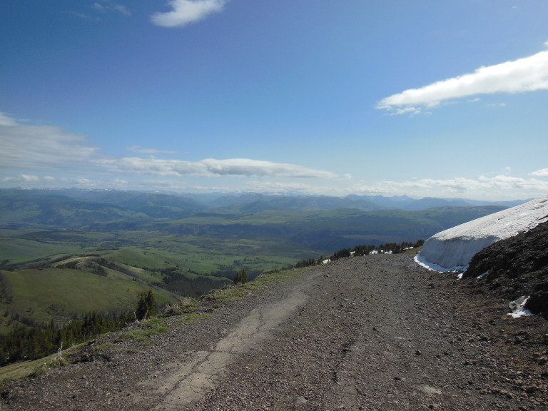 I had a leisurely lunch in a soggy grove near the shower building, stewing up some of my ramen as a sort of low-cost treat. I tried the road one last time, was informed that it wouldn’t open until 6 or so, and decided to defer Washburn until tomorrow. With the whole afternoon before me, I decided to hike up Avalanche Peak, a 10,500 ft. mountain on the east edge of the park. This is one of the most remote parts of Yellowstone, where lines of snowy peaks overlook vast tracts of burned-over forest.