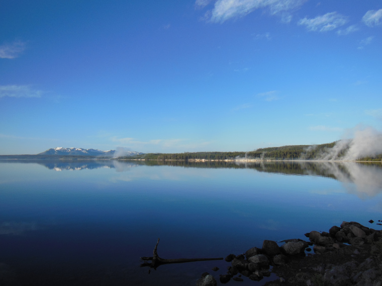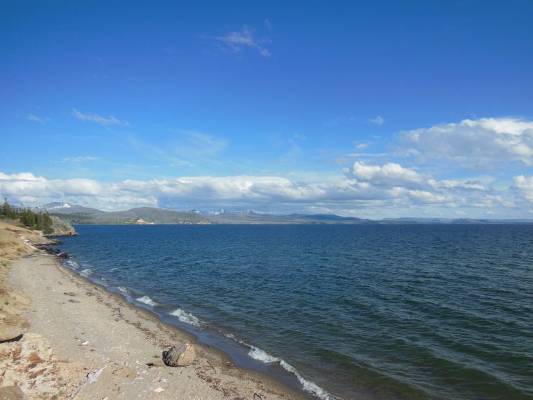 Near the end of my drive, I turned past Fishing Bridge (no fishing allowed) and stopped at the trailhead for a two-mile hike along the shore of Yellowstone Lake. This proved a pleasant surprise. All along the south and east shores of the lake, snowcapped mountains gleamed in the sunset. The view from Storm Point was especially evocative. Something about that shoreline woke in me a desire to explore – to scale those proud peaks, to walk through those virgin woods, to do the sort of thing that would end up with me starving in the wilderness somewhere. It was a curiously exhilarating feeling.