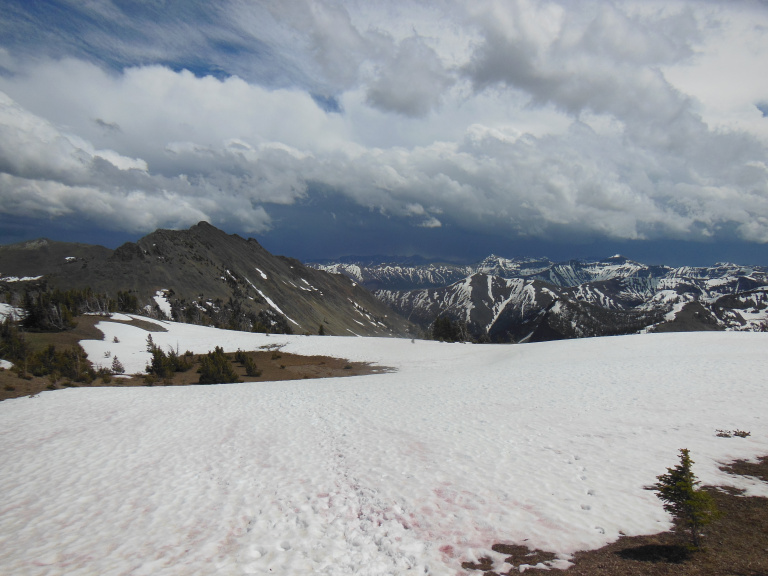As I gradually climbed through the dead forest, awesome mountain views began to materialize beyond a sea of broken branches. Once I passed the tree line, the panorama opened in all its splendor. South and east, seemingly endless lines of snowy peaks gleamed against a backdrop of back clouds. Ahead, to the west, Yellowstone Lake glimmered.
