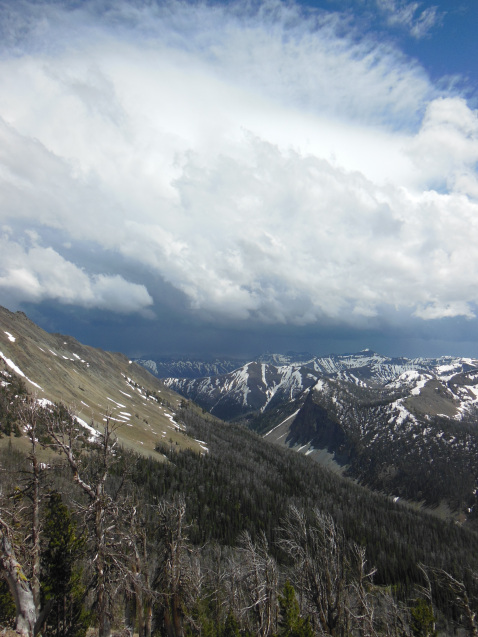 Forcing my eyes back to the trail, I clambered over a half-mile of loose snow, and finally emerged on the windswept summit. For thirty or forty miles in every direction, lakes, woods, and peaks wove patterns beneath ranks of swiftly-moving clouds. The Tetons glimmered far to the southwest. South and east, a storm was raging over the mountains, obscuring the more distant peaks with curtains of rain and snow. Lightning flickered in the storm’s heart, too distant for thunder. The only sound was that of the wind, whistling over the glacier-sharpened ridge. Cloud shadows sweeping over me, I sat on a boulder, watching the storm. The visual drama was extravagant – like something from the imagination of an especially intemperate Romantic painter. I was entranced.