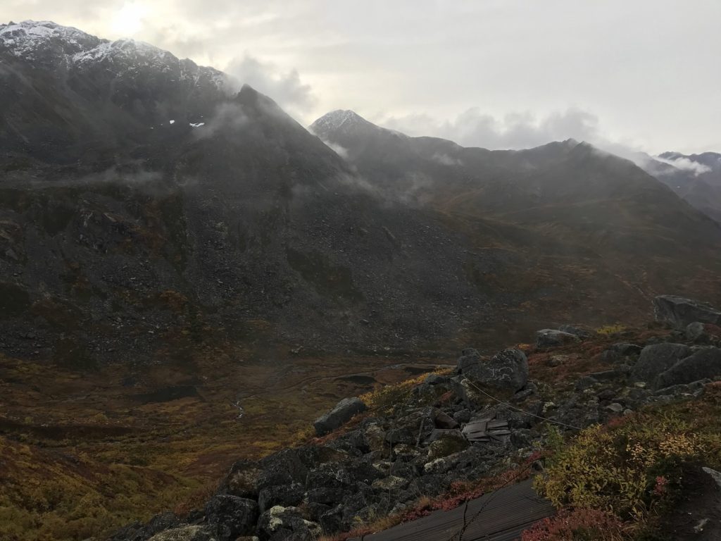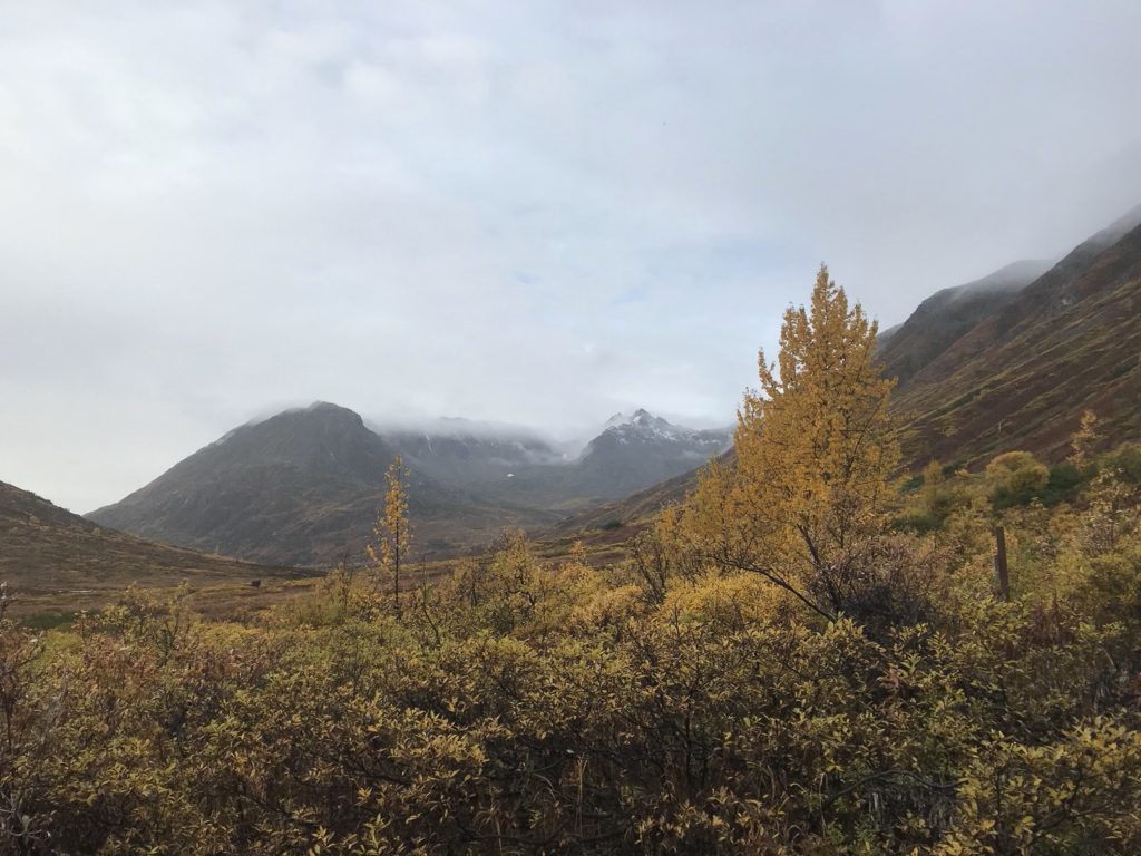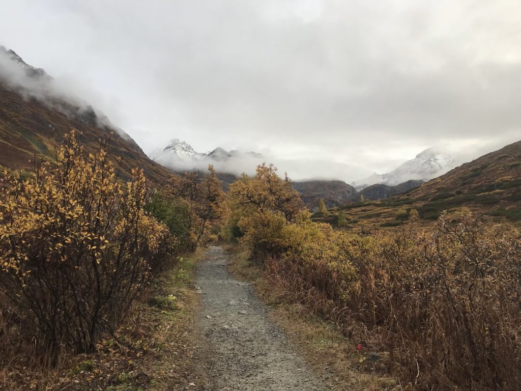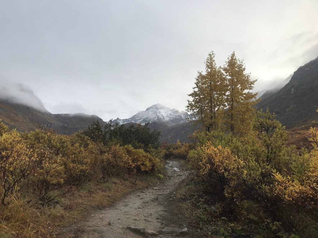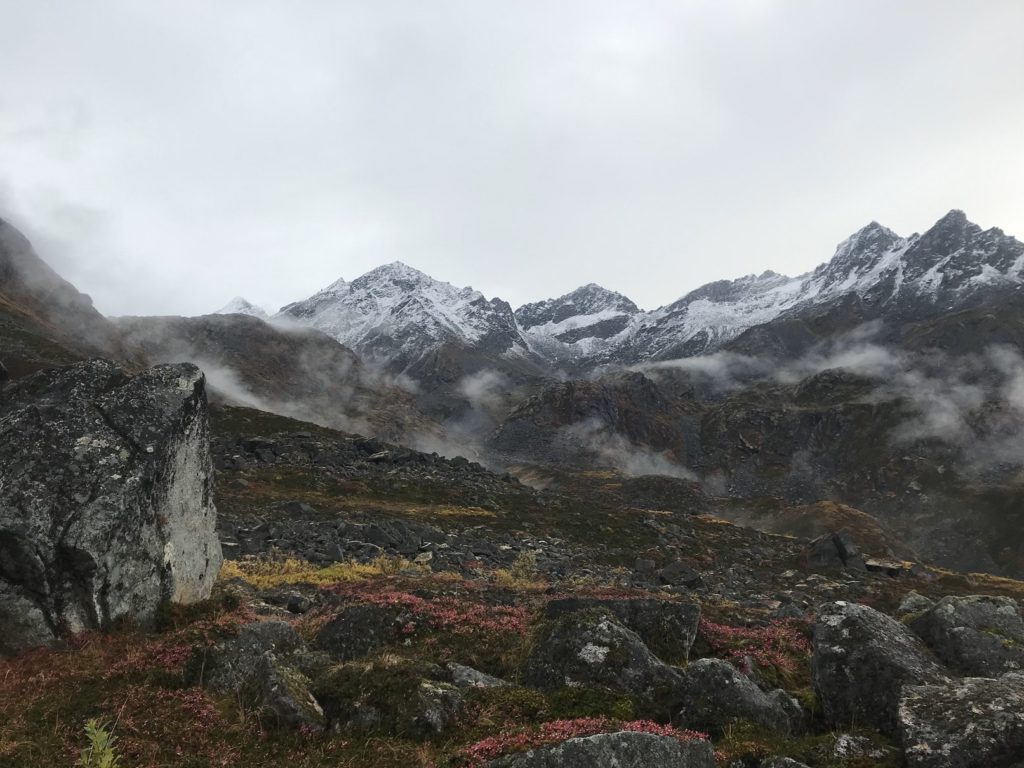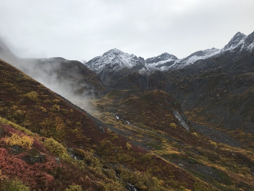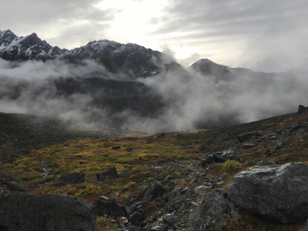 It rained today – but it was a gentle, manageable sort of rain, the sort that suits a crisp fall morning. I hiked up a gorgeous mountain valley in the heart of the Talkeetnas, drizzle pattering on my rain gear and pocking puddles in the trail. Glacial banks of fog swept over ridges and filled high valleys, sending down tongues that melted as they reached downslope.