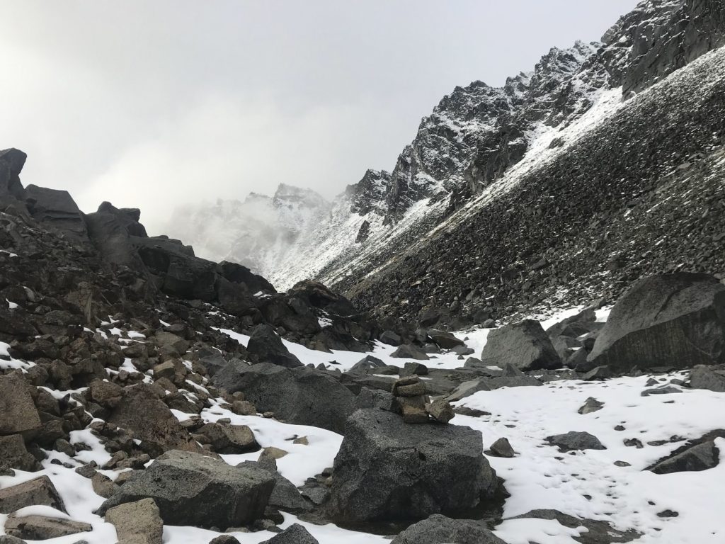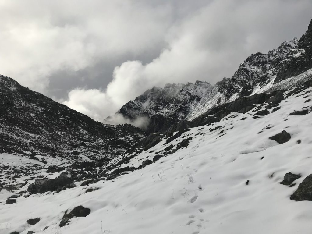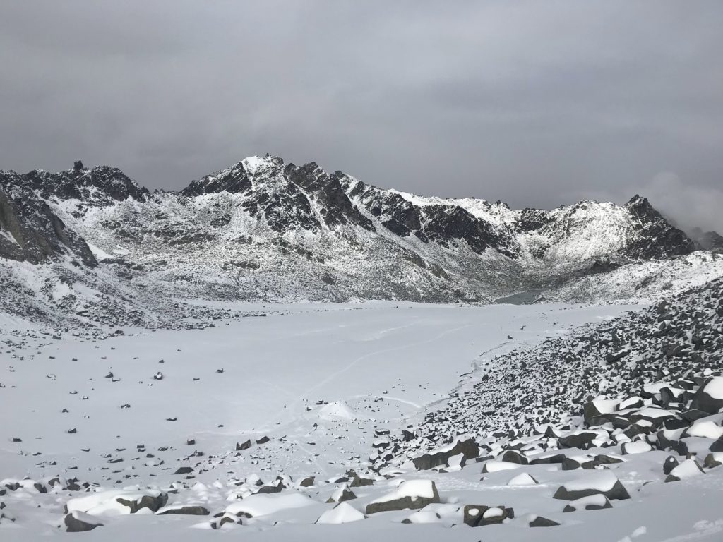 Sunlight greeted me on the far side. A break had opened in the clouds, making the snow shimmer. Below stretched Snowbird Glacier, a freshly-frozen lake at its foot. Brushing a boulder clean, I ate my lunch. Just as I was finishing, fresh clouds funneled through the pass, and a light snow began to fall.