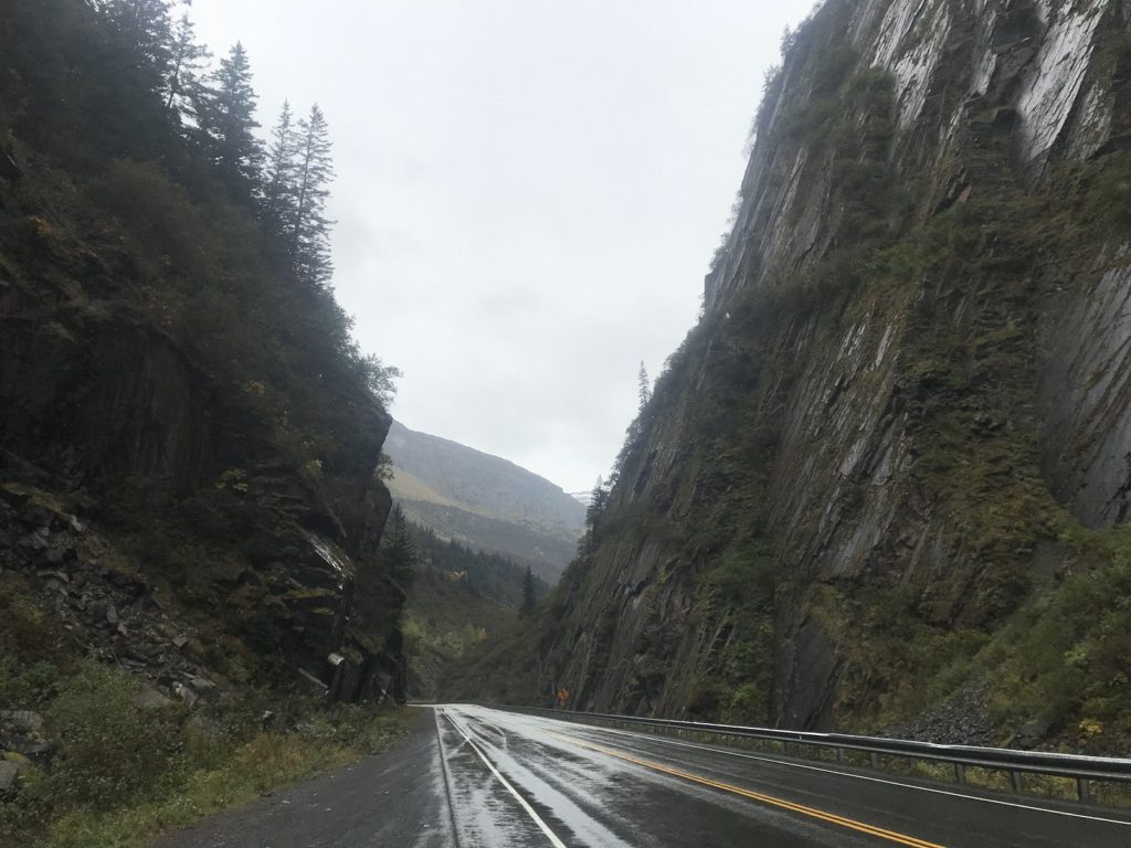 Valdez itself felt nearly as deserted. Both the campground in which I had planned to park and the restaurant at which I had hoped to gorge myself were closed for the season. Making the best of the circumstances, I went to a gas station and paid for the most refreshing shower I can remember. I restocked my canned goods at the local supermarket. Then, cleansed and provisioned, I strolled through the drizzle to Mike’s Palace Ristorante. Taking my ease in a booth (I was the only customer), I plowed through a plate of shrimp scampi, bowl of clam chowder, and basket of warm breadsticks. Through a window behind the deserted bar, rain darkened the Chugach Mountains. When I had finished my banquet, I drove back past the cliffs and waterfalls and snow poles, and pulled into a campground ringed by bleary peaks. Rain tapped all night on the Subaru’s roof.