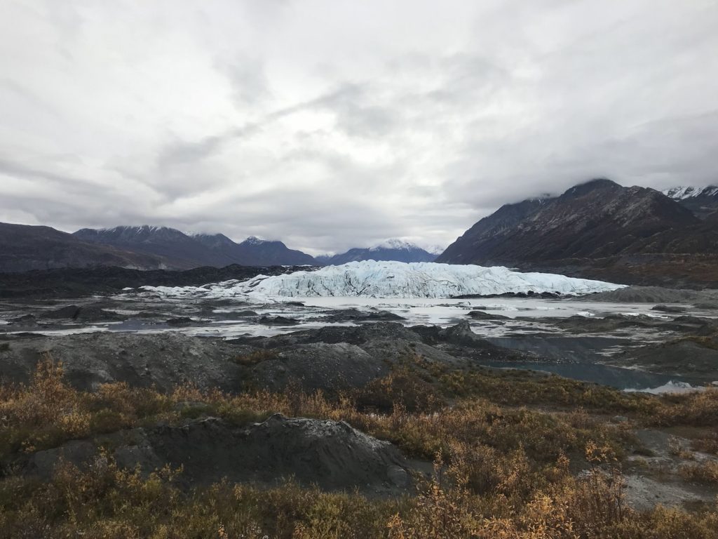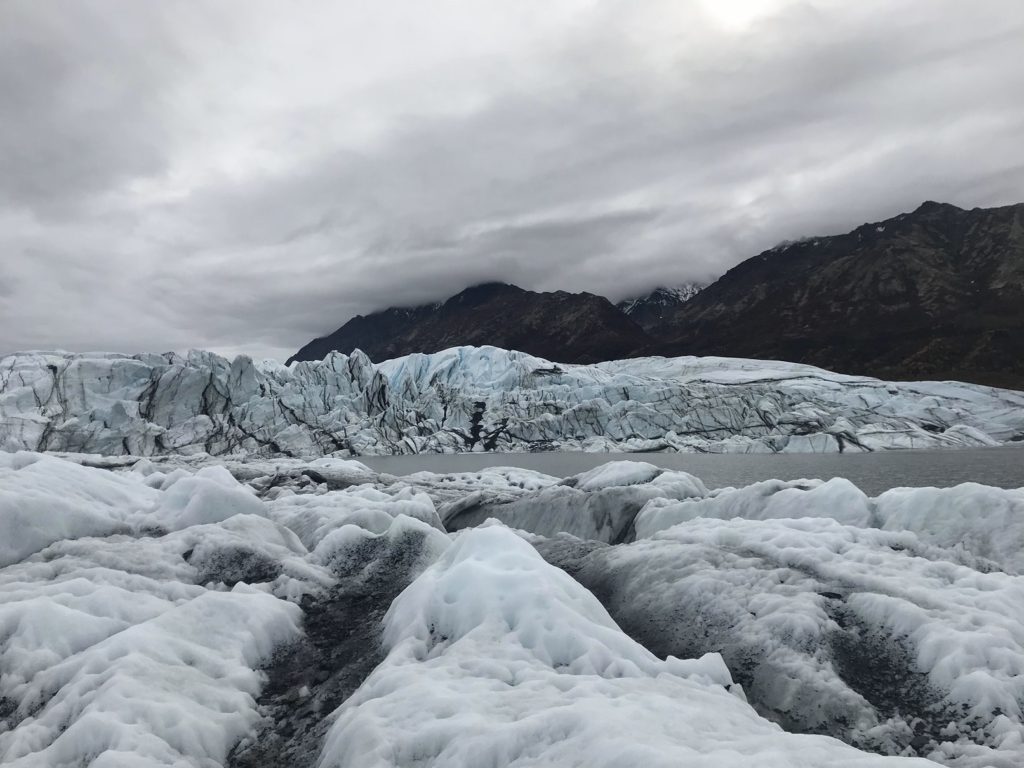 The glacier, it turned out, was Matanuska Glacier, a 30-mile river of ice that can visited for the low, low price of $30. After forking over this ambitious fee and signing a waiver that exempted the owners if I managed to fall into a crevasse, I drove out to the glacier face. Like most Alaskan glaciers, Matanuska is retreating – a half-mile or so in the past fifty years. The newly-exposed land at its terminus is a wasteland of mudflats, punctuated here and there by meltwater pools and mounds created by huge blocks of buried ice.