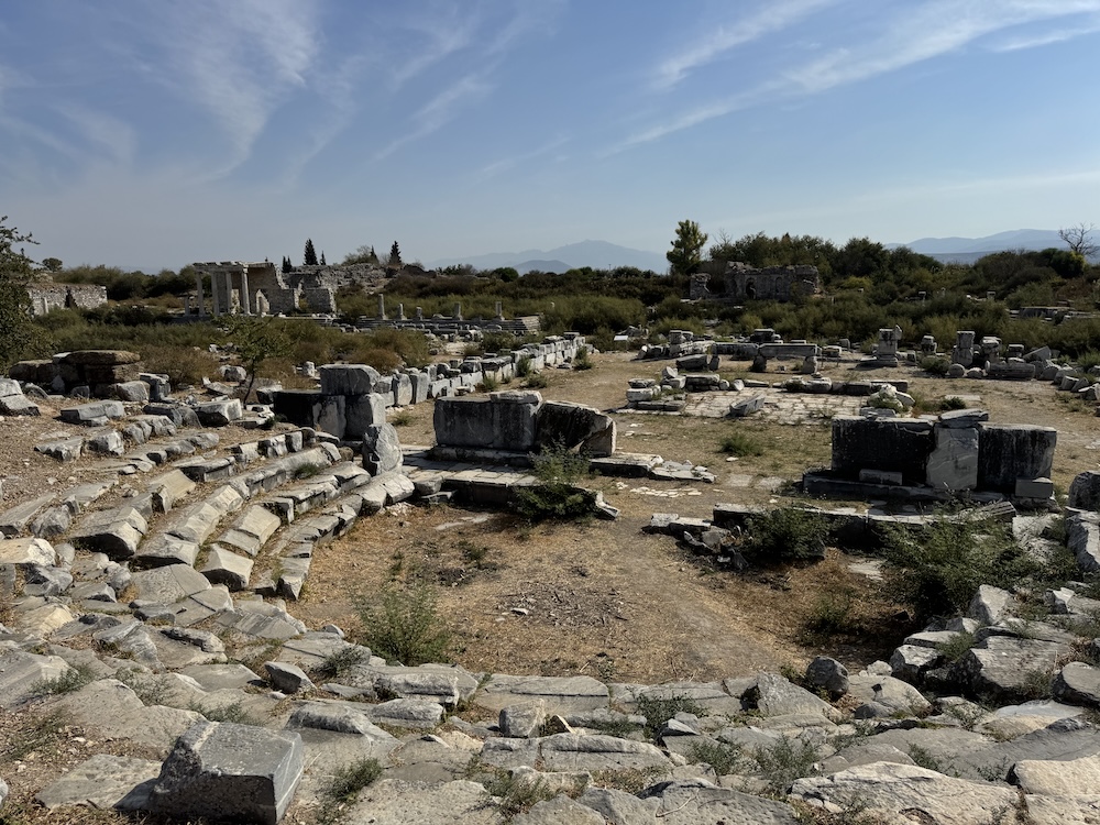 I spent the following day filming at Miletus and Didyma. I had never seen Miletus so dry. Somehow, the lack of water made the site even more mournful, the ruins protruding forlornly from cracked mud flats. Heat radiated from half-buried marble blocks, and the distant shape of Latmos presided over a waste of dead grass and leafless trees.
