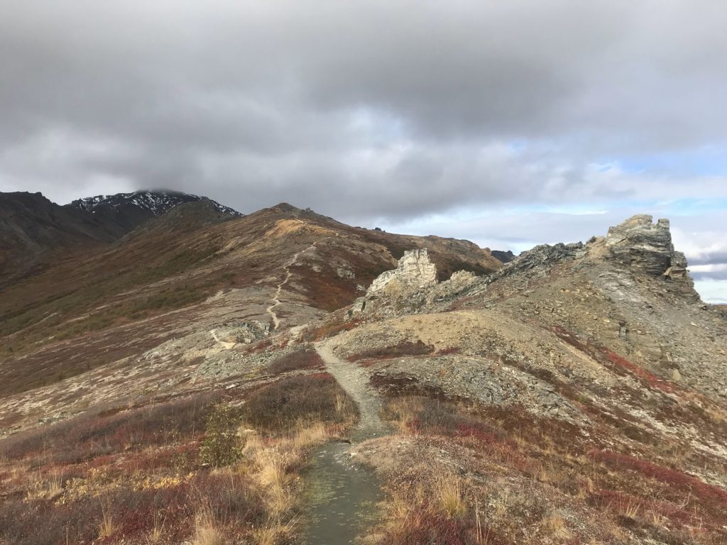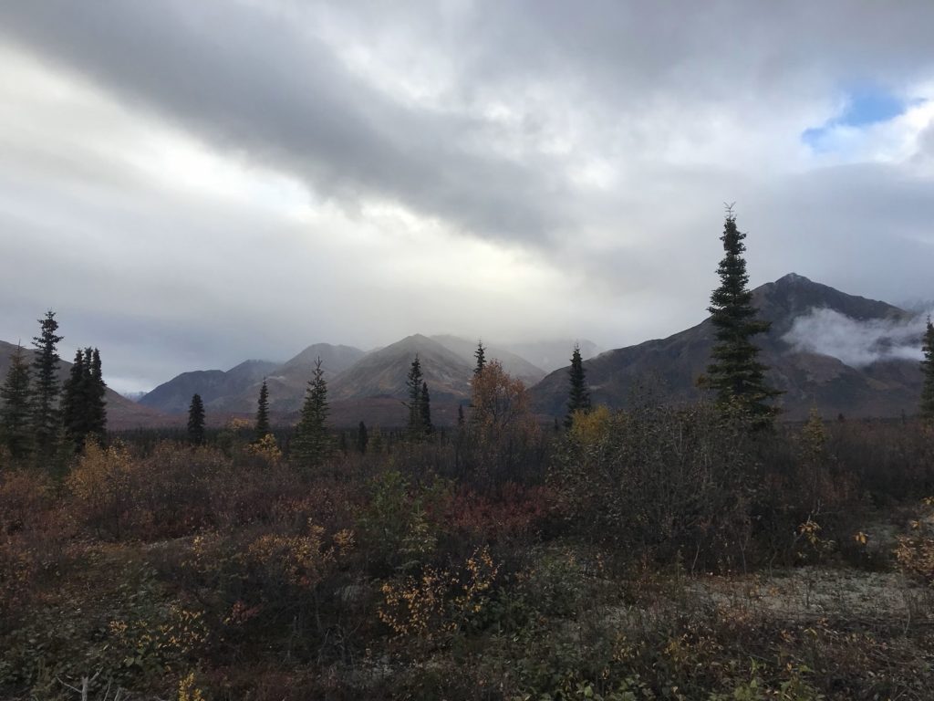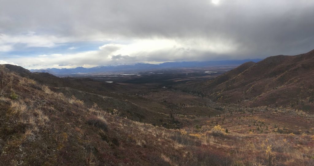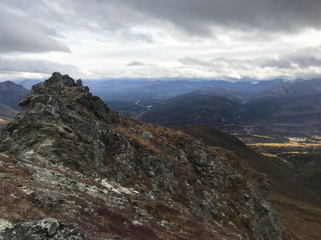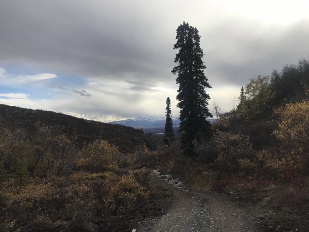 After eating my bag lunch at a pullout with a panoramic view of the Alaska Range, I returned to the park to hike the Mount Healy trail. The first few miles consisted of an uneventful, if steep, climb to an overlook of the park entrance area. Even for this panorama-saturated corner of creation, the view was impressive: a patchwork of golden birches and emerald pines in the valley below, long lines of snowy peaks on either side. Dark clouds boiled over Denali.