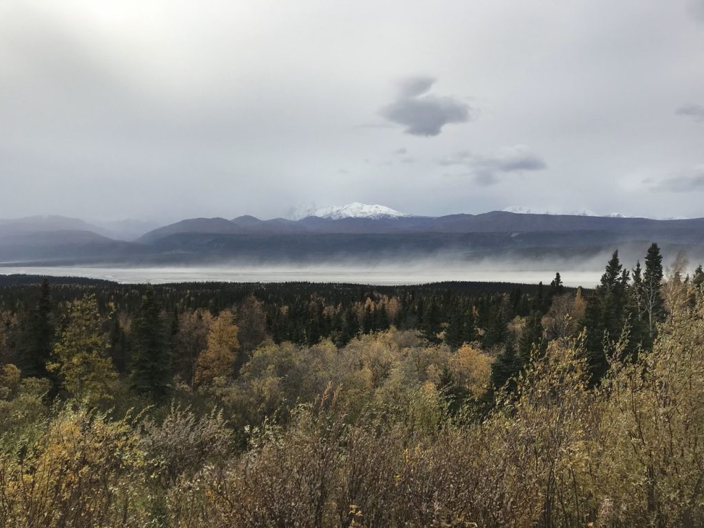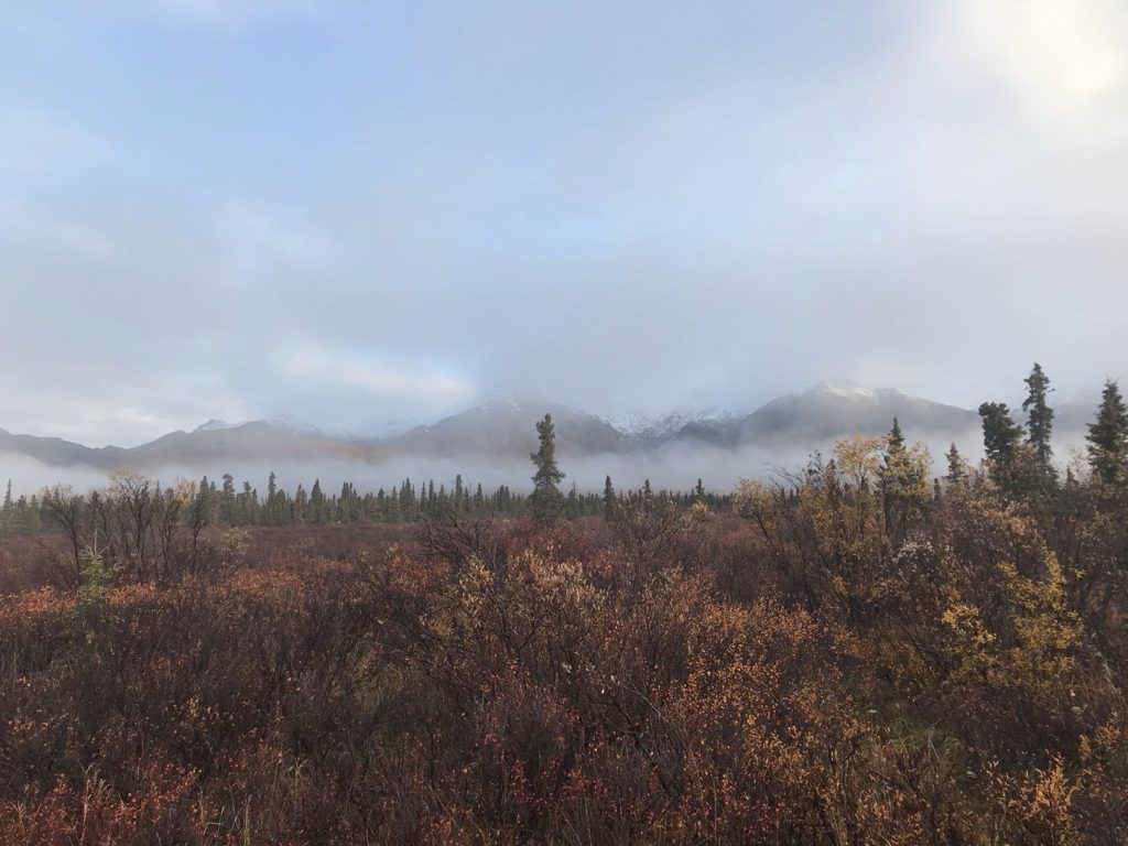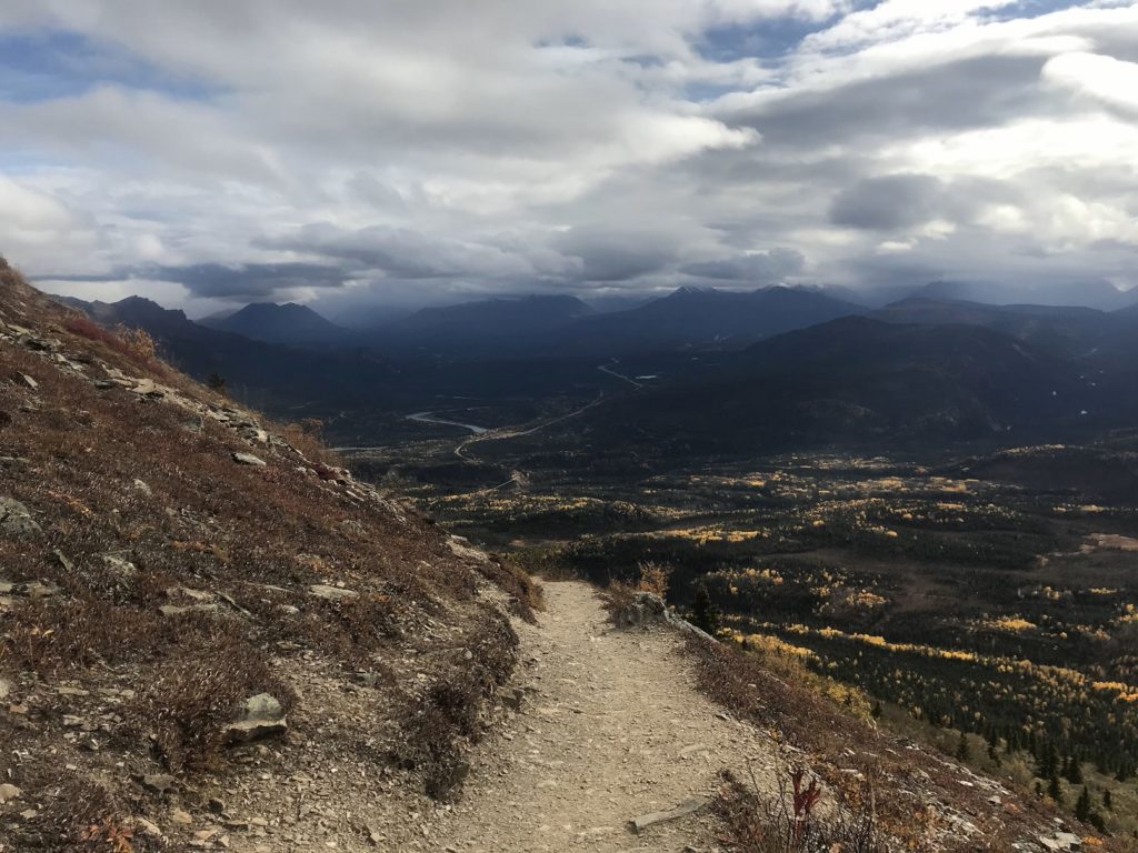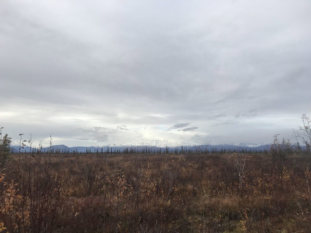 After eating my bag lunch at a pullout with a panoramic view of the Alaska Range, I returned to the park to hike the Mount Healy trail. The first few miles consisted of an uneventful, if steep, climb to an overlook of the park entrance area. Even for this panorama-saturated corner of creation, the view was impressive: a patchwork of golden birches and emerald pines in the valley below, long lines of snowy peaks on either side. Dark clouds boiled over Denali.