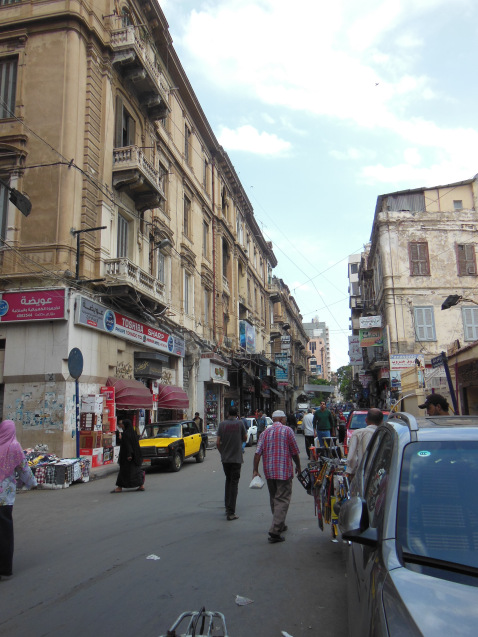 It now after 4; and since all the museums were closed, I decided to spend the rest of the afternoon among the neoclassical buildings of colonial Alexandria. Whole streets of late nineteenth and early twentieth century structures, usually six or seven stories tall, formed grand and harmonious facades along most of the avenues in the old European quarter, lending the area an almost Viennese or Parisian feel. The effect was dampened, however, by a half-century of Egyptian accretions: wild spider webs of telephone and electrical wires, densely packed shop fronts, and about a half-inch of grime.