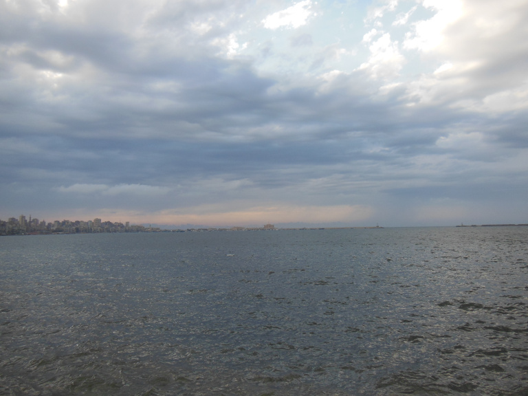 I concluded my walk in the monumental square fronted by the famous Hotel Cecil, centered on a lawn of windblown palms, and dominated by the view of Qaitbey across the harbor. I dashed across the busy Corniche (the seaside boulevard) to admire the view. A storm had blown up over the Mediterranean, framing the old fortress with a rack of black clouds; whitecaps, whipped by a stiff north wind, drove over the empty harbor to dash against the seawall. It was all very dramatic; but the breeze was chilly, and so I retreated to a nearby café.  This proved to be another relic of colonial Alex, which served excellent soups and seafood. Since it was only 6 (most Egyptians take dinner around 9), I was the only diner, seated at a table facing the windy bay.